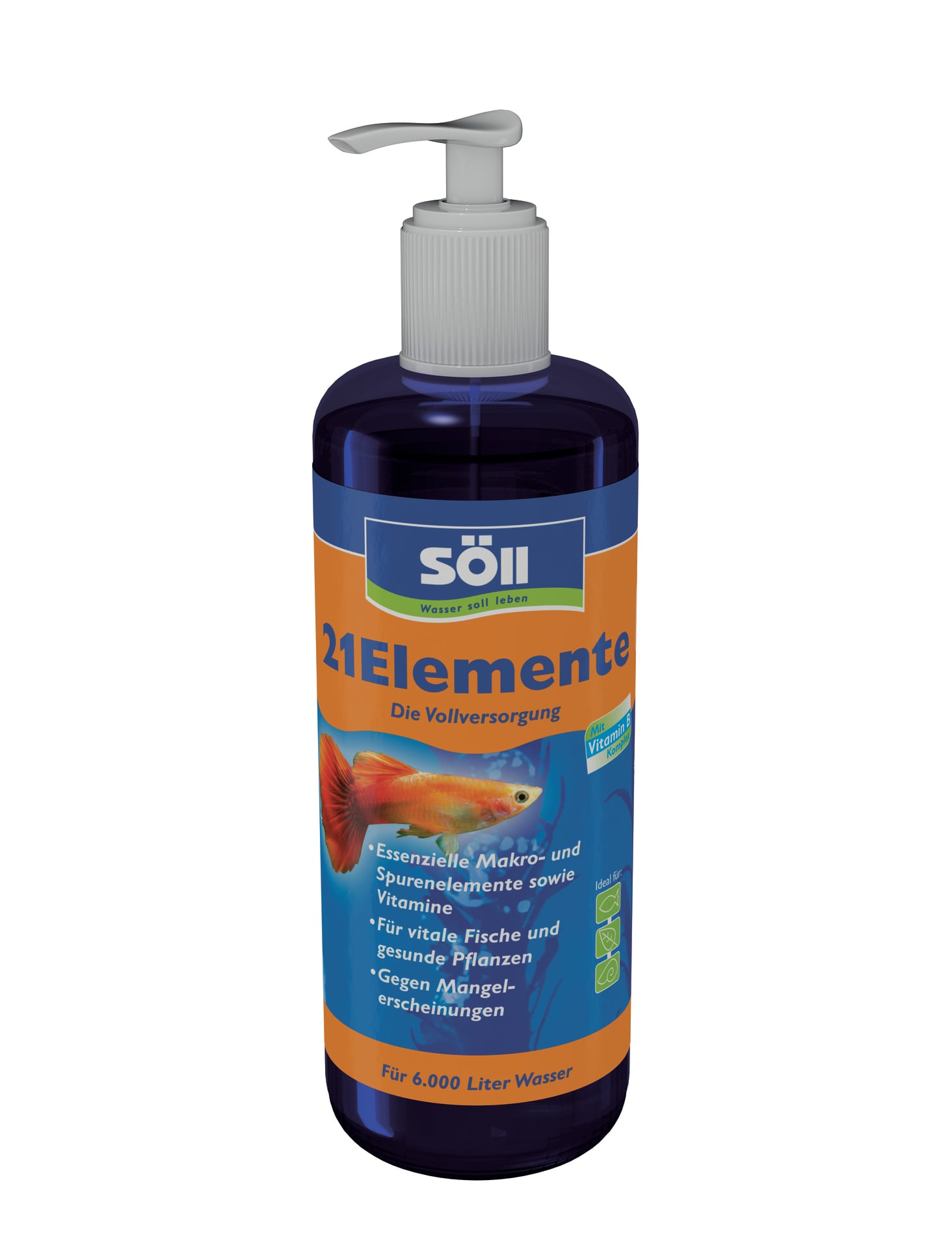Künstliche Systeme wie das Aquarium verarmen aufgrund schneller Bioabläufe sehr stark und bedürfen somit der regelmäßigen Zufuhr von Mineralien, Spurenelementen und wasserlöslichen Vitaminen. Denn diese Vitalstoffe können von den Organismen nur selten gespeichert werden. Ein Mangel selbst einzelner Elemente kann bei Fischen zu leichten bis schweren Störungen, wie erhöhter Anfälligkeit für Krankheiten, Minderwuchs, Fressunlust und herabgesetzter Agilität führen. Für ein funktionierendes Aquarium sind Bioelemente zur Gesunderhaltung von Tieren und Pflanzen zwingend notwendig. Egal ob Fische, Wirbellose oder Wasserpflanzen – 21Elemente ist der Alleskönner fürs Aquarium. 21Elemente enthält alle für das aquatische Leben wichtigen Makro- und Spurenelemente sowie Vitamine: Titan, Cobalt, Iod, Mangan, Molybdaen, Zink, Natrium, Schwefel, Stickstoff, Zinn, Magnesium, Chlor, Aluminium, Brom, Eisen, Kalium, Kupfer, Nickel, Bor, Strontium und Lithium.