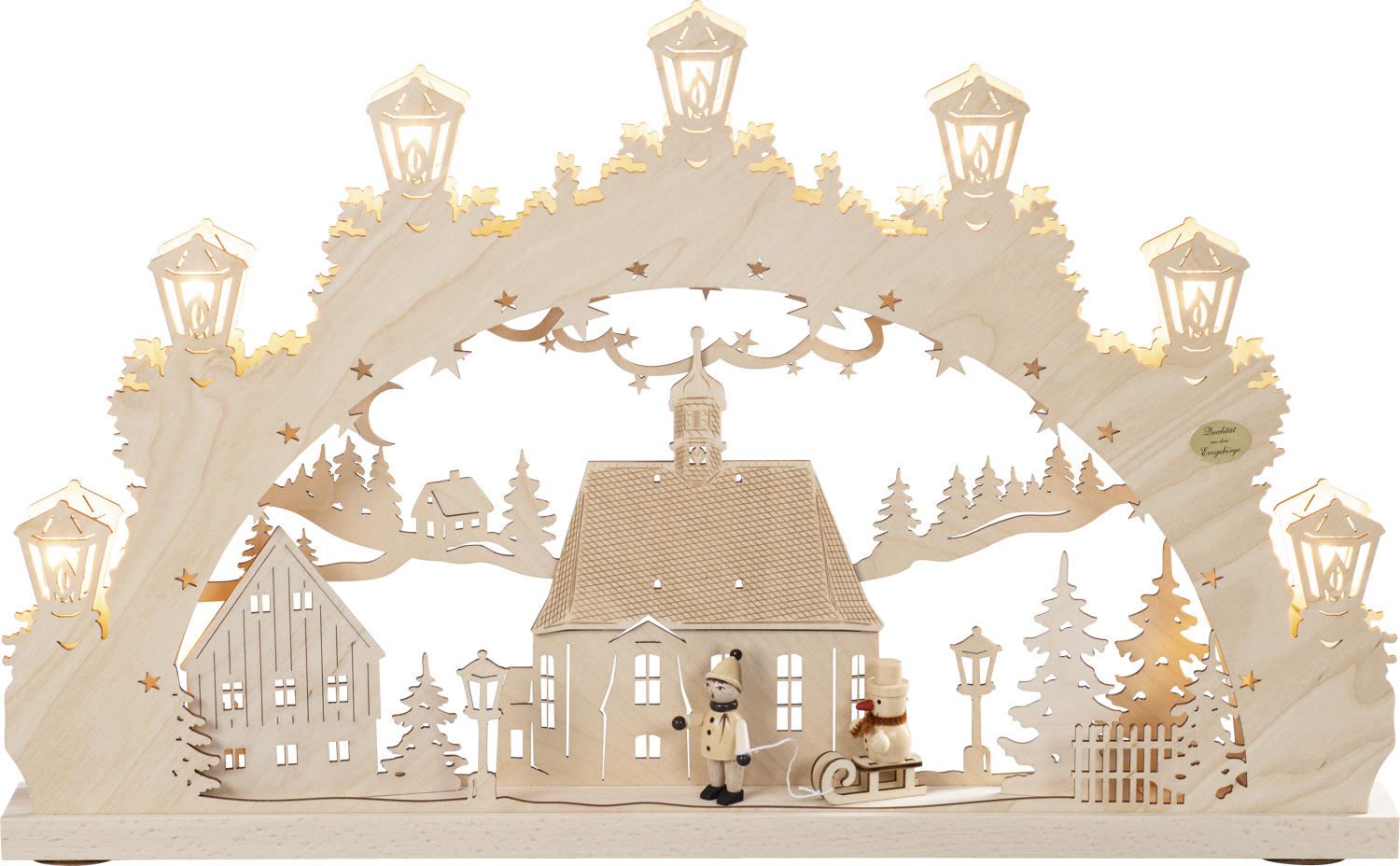 Der 3D-Effekt macht den Schwibbogen zu etwas ganz Besonderem. Der „Kind mit Schlitten“-Schwibbogen greift eines der beliebtesten Motive auf und die 7-flammige indirekte Beleuchtung sorgt für einen wundervollen Schein am Abend. Aufgrund seiner Abmessung passt der Schwibbogen in jedes Fenster und das Motiv hält sich an die gewohnte Umgebung. Mit seiner Herkunft aus dem Erzgebirge wird der Schwibbogen durch viel Können und Handwerkskunst gefertigt.