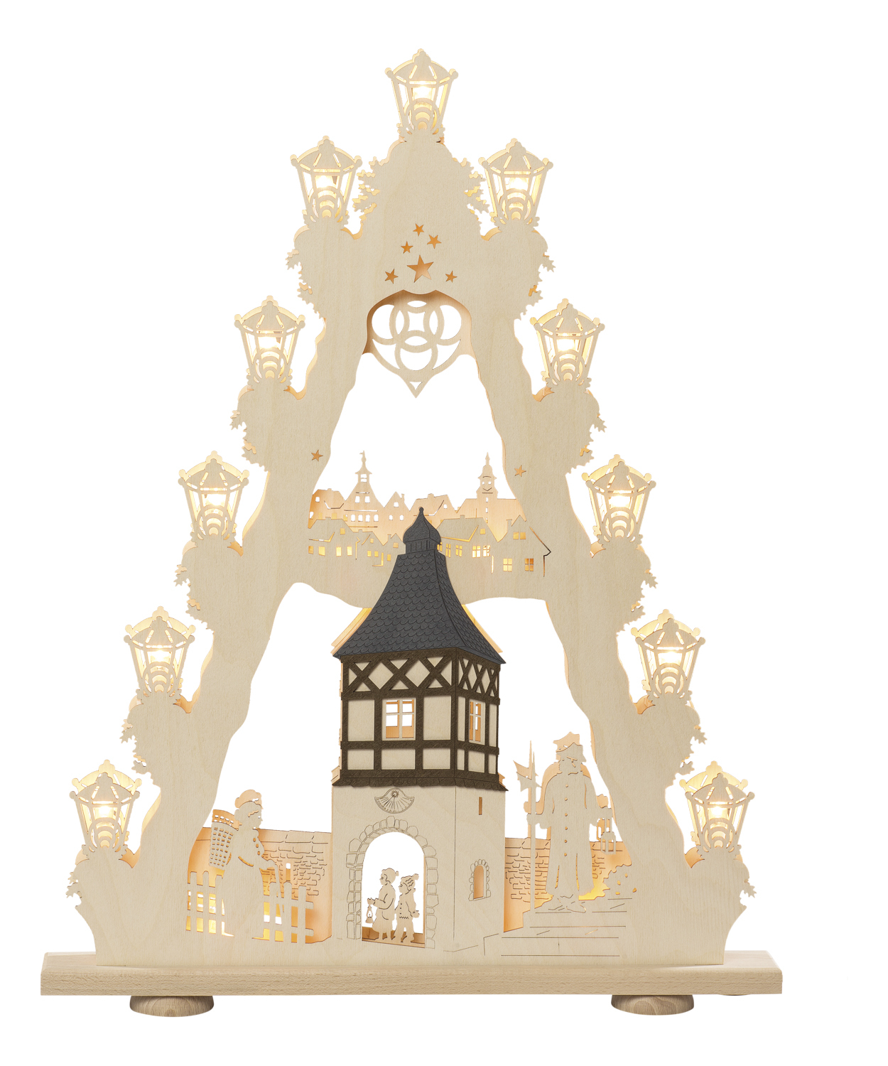 Deine Suche nach der perfekten Lichterspitze ist endlich vorbei! “Burgromantik” ist genau das, wonach du gesucht hast. Die insgesamt 15 flammigen Lichter – 4 Lampen leuchten das Innere aus – sind liebevoll mit einem ganz romantisch-klassischen Weihnachtsmotiv gestaltet. Diese Lichterspitze veredelt ihren Standort, egal ob du sie auf der Fensterbank oder einer Kommode platzierst. Kabel und Lampen sind dekorativ versteckt, sodass nichts die filigrane Optik mit Fachwerkmotiv und alter Burgmauer, Nachtwächter, Händlerin und Kindern stört. Spannend ist die Perspektive auf das kleine Dorf im Hintergrund. Das Torhaus ist zweifarbig gestaltet und sorgt für einen wundervollen Kontrast. Es handelt sich hierbei um ein Originalprodukt aus dem Erzgebirge. Die Lichterspitze steht auf einem soliden Sockel und ist hochwertig und langlebig verarbeitet. Zudem wird sie sicher und haltbar verpackt. Die Abmessung der Lichterspitze beträgt 52 x 67 x 6 cm.