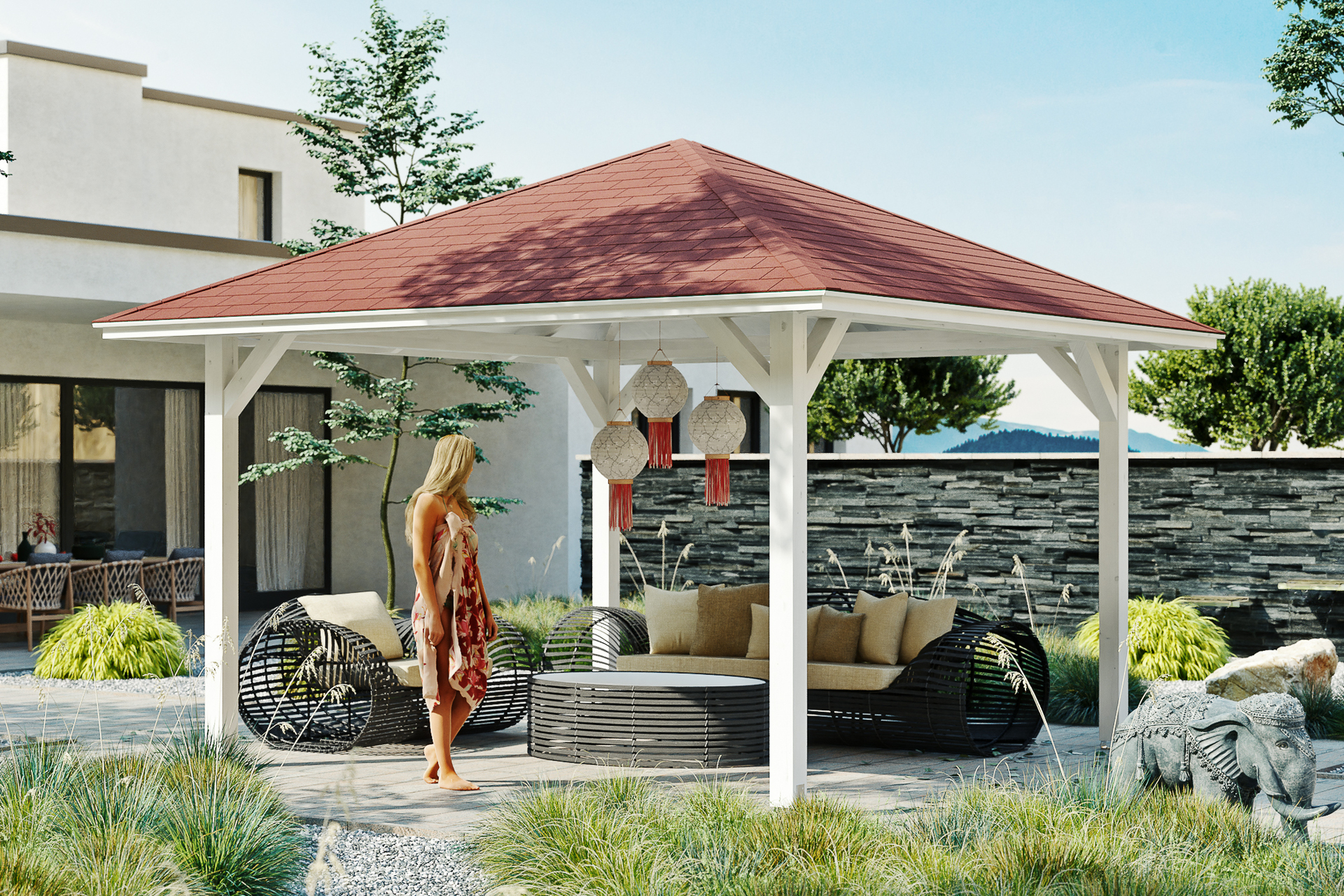 Das Dach wird mit 20 mm starker Dachschalung zur Eindeckung mit Dachschindeln geliefert (Dachschindeln sind als Zubehör optional bestellbar).