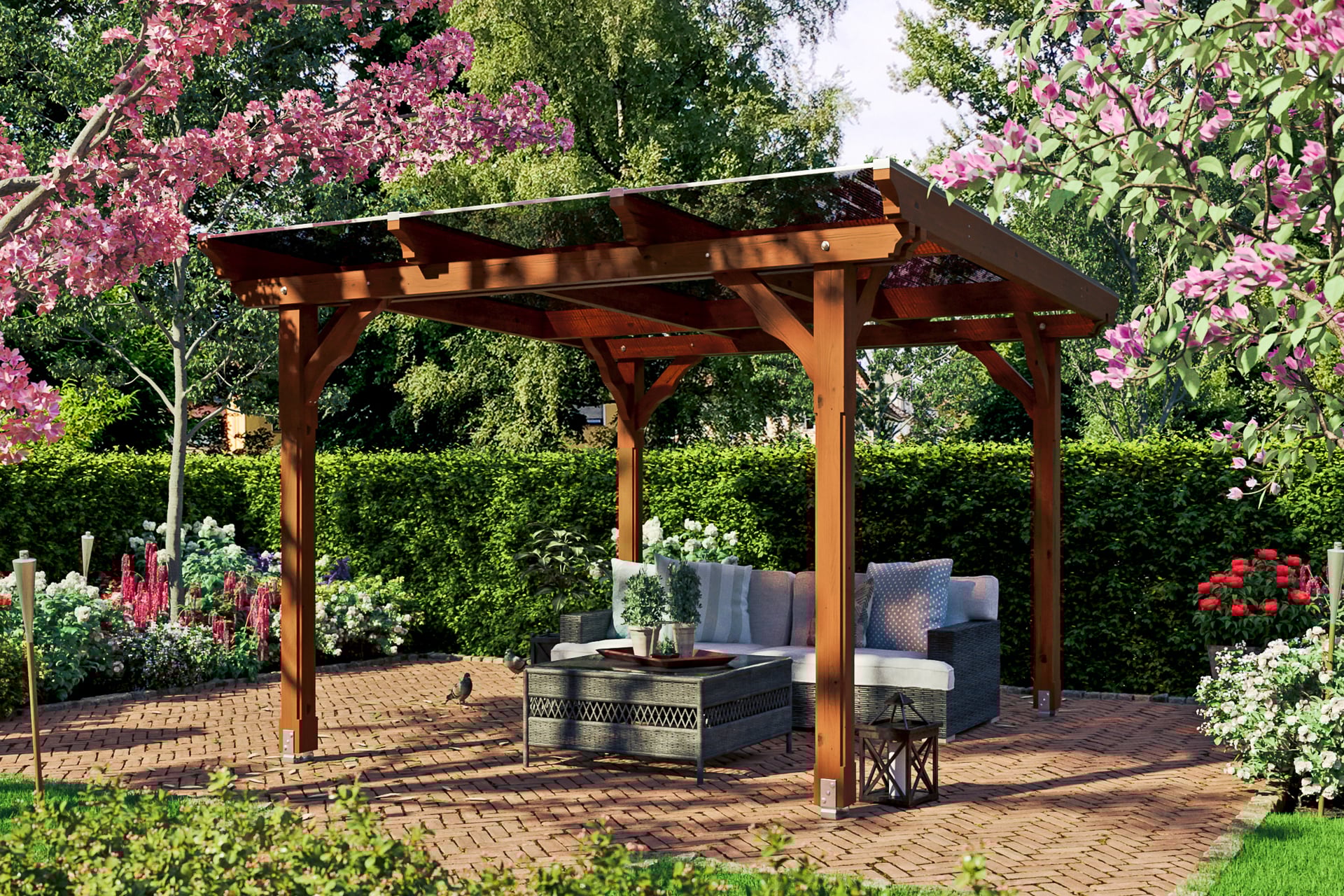 Die Dacheindeckung besteht aus stabilen, 10 mm dicken Polycarbonat Doppelstegplatten. Die Oberseite ist mit einer UV-reflektierenden Schicht versehen. Befestigt werden diese durch hochwertige Aluminium-Profile mit EPDM-Lippendichtungen.