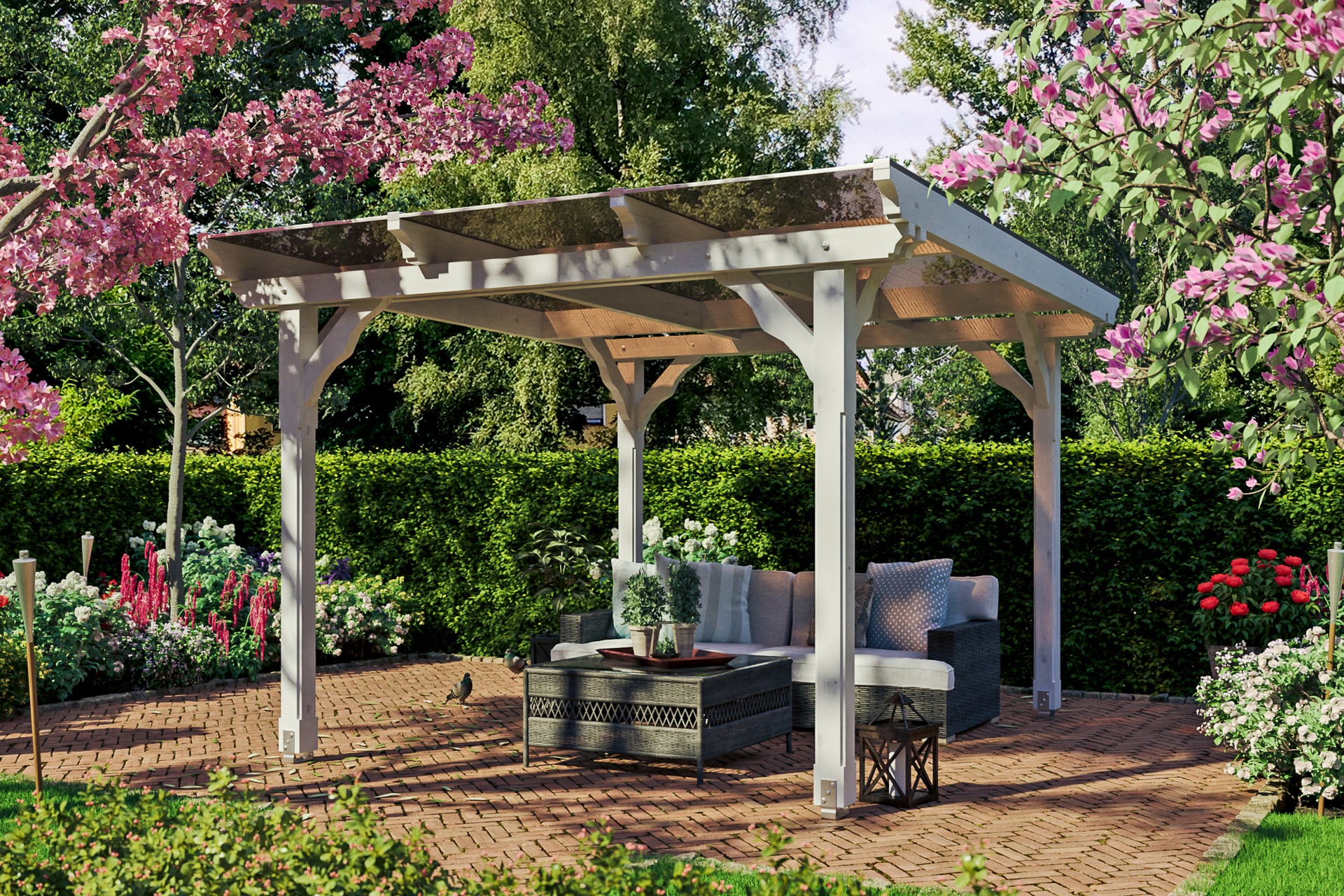 Die Dacheindeckung besteht aus stabilen, 10 mm dicken Polycarbonat Doppelstegplatten. Die Oberseite ist mit einer UV-reflektierenden Schicht versehen. Befestigt werden diese durch hochwertige Aluminium-Profile mit EPDM-Lippendichtungen.