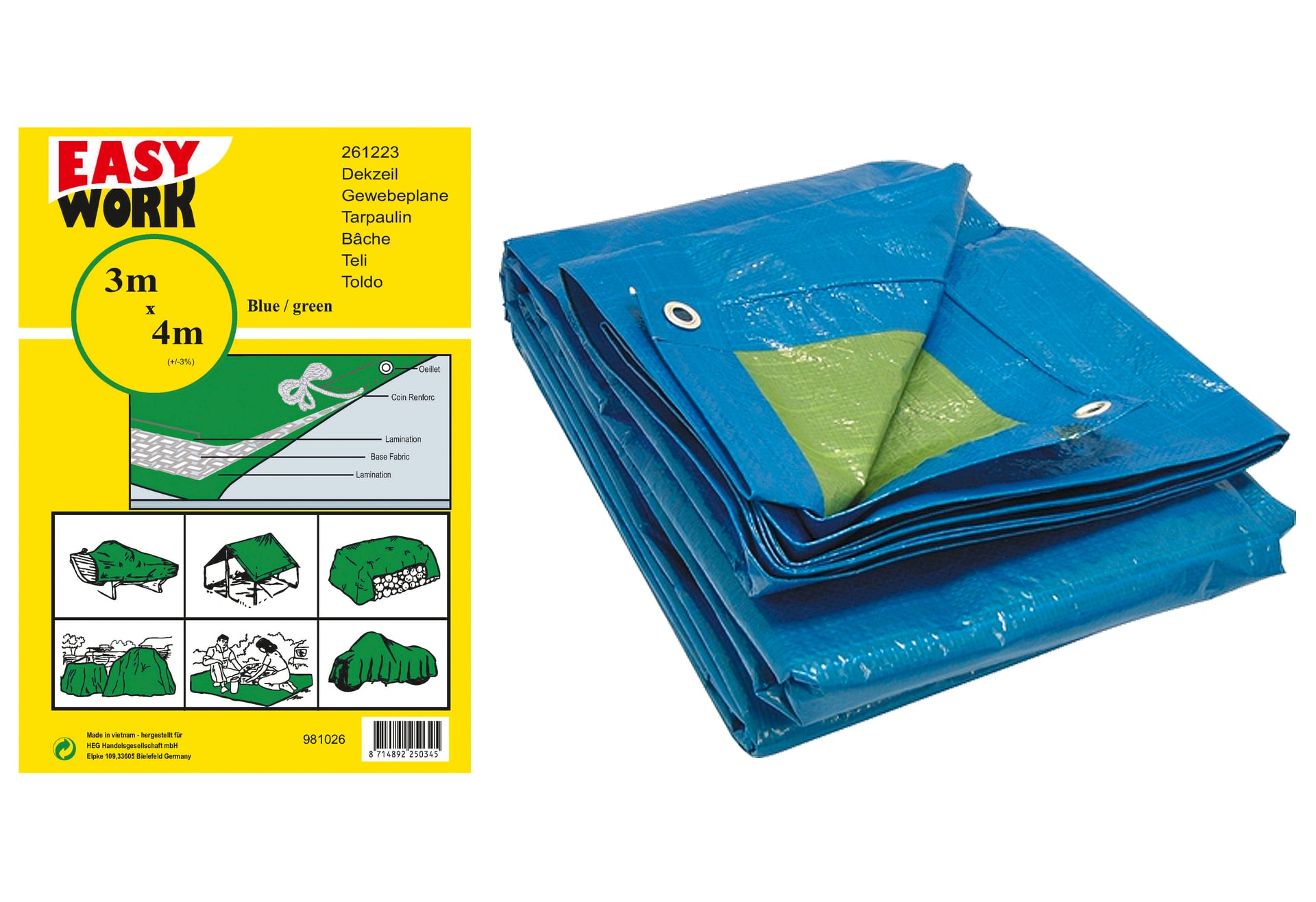 Gewebeplane, mit Ösen, ca. 3×4 mtr., aus Polyethylen mit verstärktem Rand, wasserfest, Ösenabstand 100cm, ca. 80gramm/qm, grün/blau