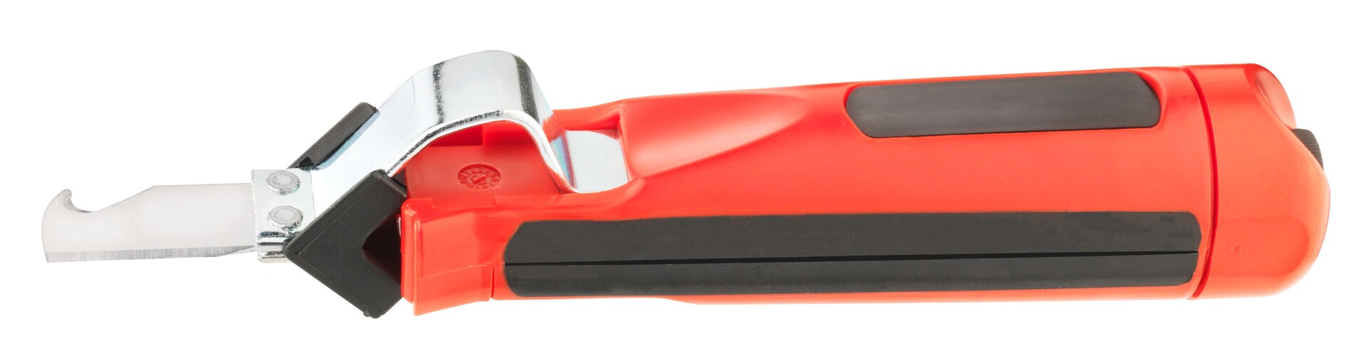 CONNEX Abmantelmesser mit Hakenklinge. Das Abmantelmesser ist für Kabel von 8 – 28 mm Ø geeignet. Es hilft beim schnellen und präzisen Aufschlitzen und Entmanteln von Feuchtraumkabeln, mit selbstständiger Messerumstellung von Rund- und Längsschnitten. Die Hakenklinge dient zum Aufschlitzen und Entmanteln von Gummi- und Weich-PVC-Kabeln und die Schnitttiefen-Einstellung erfolgt am Griffende durch eine Stellschraube. Made in Germany.