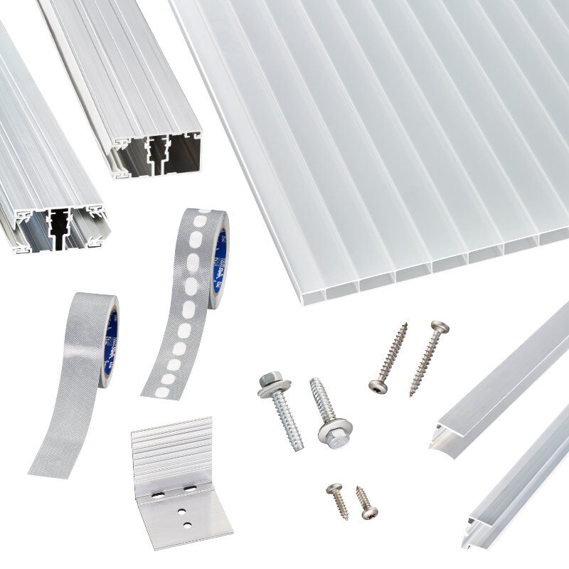 Opal-weiß anti-drop 16 Acryl Stegplatte Unser Komplettset enthält alles was Sie für ihr Terrassenbedachung benötigen. (Unterkonstruktion und Zierklemmdeckel nicht enthalten) Die Doppelstegplatte aus Acryl überzeugt mit ihrer Hagelfestigkeit und ihrer Beständigkeit gegenüber UV-Strahlen. Außerdem hat sie die bewährte anti-drop-Beschichtung, die das Tropfen bei Temperaturumschwüngen verhindert. Die opal-weiße Stegplatte lässt das Licht zu etwa 75% durch und durch die leicht milchige Optik ergibt sich eine gleichmäßige Lichtverteilung. Im Gegensatz zum einfachen Verlegeprofil sind beim hochwertigen Verlegeprofil bereits die Dichtlippen auf Ober- und Unterprofil eingezogen. Diese sorgen für eine hervorragende Abdichtung der Stegplatten. Außerdem verfügt das Unterprofil vom hochwertigen Verlegeprofil zusätzlich über Belüftungsrillen, die für eine optimale Luftzirkulation zwischen Profil und Unterkonstruktion sorgen. Der integrierte Schraubkanal sorgt zudem für eine optimale Verschraubung und Montage der Verlegeprofile. Verfügbare Längen in m: 2,00 – 2,50 – 3,00 – 3,50 – 4,00 – 5,00 – 6,00 – 7,00 Es handelt sich um feste Längen. Bitte geben Sie Ihr Wunschmaß ein, wir schneiden die Platten auf Ihr Wunschmaß zu und legen die Reststücke der Lieferung bei. Hinweise Bei zusätzlicher Montage eines Sonnensegels oder Ähnlichem, muss für eine optimale Belüftung ein Mindestabstand von 40cm gegeben sein, um Hitzestaus zu vermeiden. Nicht geeignet bei landwirtschaftlicher Tierhaltung, da die Ammoniaksäure das Material angreift! Hinweise zur Lagerung nach der Lieferung sind unbedingt zu beachten!