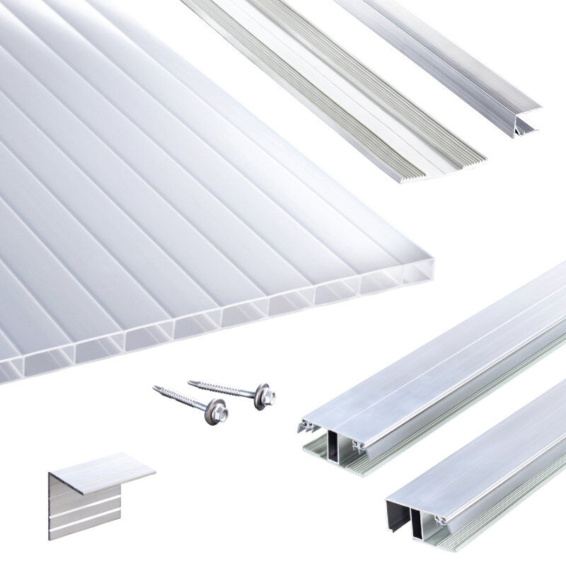 Terrassendach-Set mit opal-weißer 16 mm Acryl Stegplatte und Kombinationsverlegeprofil Die opal-weißer Stegdoppelplatte bietet eine Lichtdurchlässigkeit von 76 %. Ihr großzügiger Stegabstand von 32 mm gewährleistet eine optimale Balance aus hoher Eigenfestigkeit, Stabilität und ansprechender Optik. Die einseitige No-Drip-Oberflächenbeschichtung verhindert die Bildung von Regentropfen, indem sie einen gleichmäßigen Wasserfilm erzeugt, der einfach abläuft. Dadurch bleibt die Oberfläche länger sauber und trocknet schneller. Der Hersteller sichert die hohe Qualität und Langlebigkeit der Platte mit einer 10-jährigen Garantie. Stabiles Kombinationsprofil für sichere Montage Das im Set enthaltene Kombinations Mittel- und Randprofil (60 mm breit) wurde speziell für 16 mm Stegplatten entwickelt. Es kombiniert ein robustes Aluminium-Oberprofil mit einem separat erhältlichen Weichgummiprofilband als Plattenauflage. Lippendichtungen bieten zusätzlichen Schutz vor eindringendem Regenwasser und sorgen für eine dauerhafte Dichtigkeit Ihrer Konstruktion. Set Inhalt Stabilo Stegplatten Kombinations Mittel- und Randprofile Weichgummiprofilbänder Alu Abschlussprofile Alu-Profilabschlusswinkel Edelstahlschrauben Erweiterbar mit passenden Klemmdeckeln Für den optisch ansprechenden Abschluss Ihrer Terrassenüberdachung empfehlen wir die optional erhältlichen Alu-Klemmdeckel, erhältlich in pressblank, weiß (RAL 9016) oder anthrazit (RAL 7016). Diese ergänzen das Mittelprofil ideal und werten Ihre Konstruktion professionell auf. Verwendungsbereich Terrassenüberdachungen, Carports, Wintergärten, Vordächer, Gewächshäuser, Industriehallen Verfügbare Längen in m 2,00 – 2,50 – 3,00 – 3,50 – 4,00 – 5,00 – 6,00 – 7,00 Verfügbare Dachbreiten in m 3,015 – 4,020 – 5,025 – 6,030 – 7,035 – 8,040 – 9,045 – 10,050 – 11,055 – 12,060 – 13,065 – 14,070 – 15,075 Hinweise Polycarbonat Stegplatten sind nicht geeignet bei landwirtschaftlicher Tierhaltung, da die Ammoniaksäure das Material angreift! Hinweise zur Lagerung nach der Lieferung sind unbedingt zu beachten!
