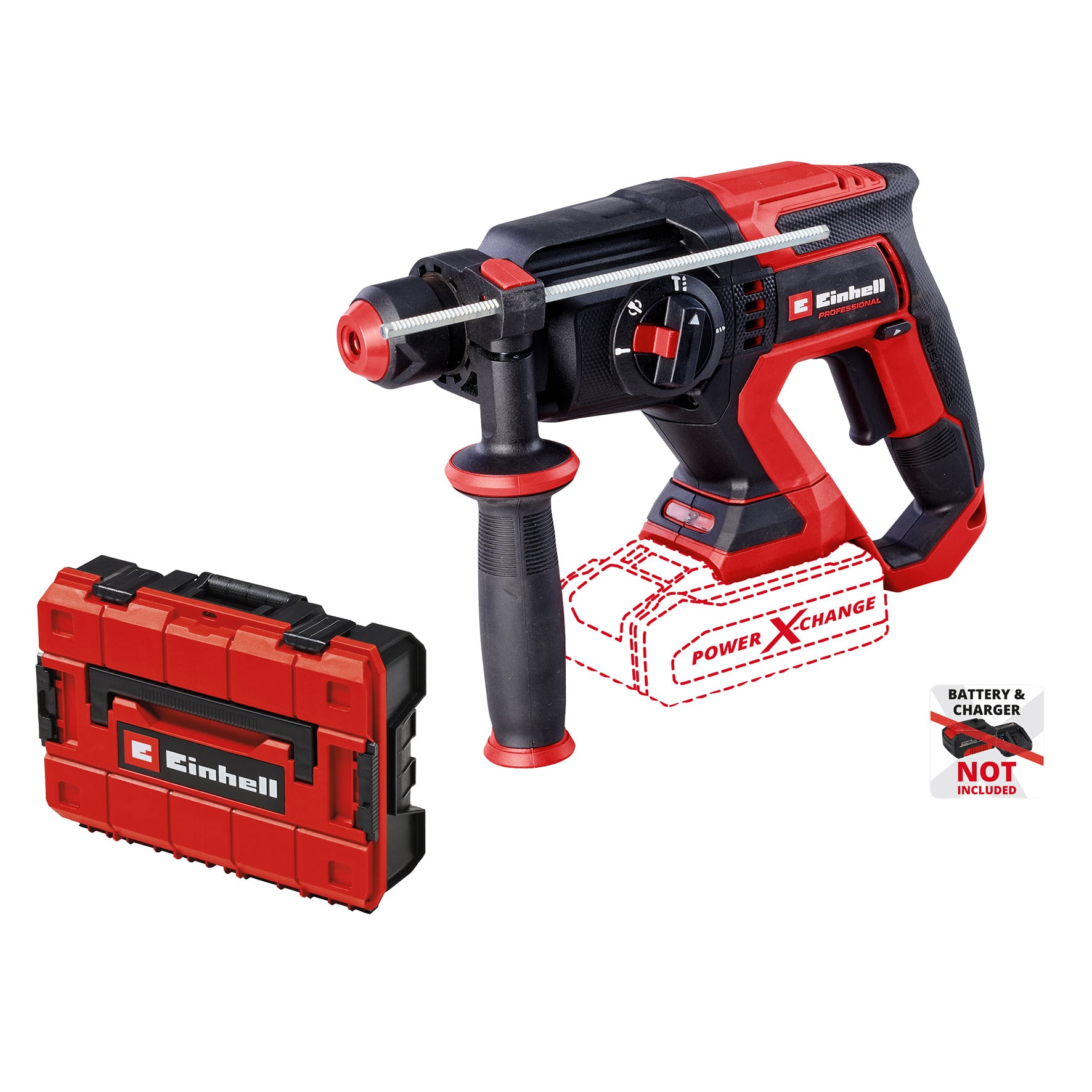 Der Einhell Professional Akku-Bohrhammer TP-HD 18/22 D Li BL-Solo ist ein echter Allrounder für Heimwerker wie auch für professionelle Handwerker. Er vereint vier Funktionen in einem Gerät: Bohren, Hammerbohren und Meißeln mit und ohne Fixierung. Per zentralem Schalter lässt sich die jeweilige Funktion einstellen. Angetrieben wird das Gerät von dem kraftvollen Einhell Brushless Motor. Dieser bürstenlose Motor bietet mehr Kraft und eine längere Laufzeit als herkömmliche Kohlebürsten-Motoren. Nach einer Online-Registrierung gelten 10 Jahre Garantie auf den Brushless-Motor. Der Akku-Bohrhammer ist Teil der Power X-Change Familie, in der sich alle Akkus, Geräte und Ladegeräte miteinander kombinieren lassen. Das kraftvolle, pneumatische Schlagwerk arbeitet mit einer Schlagstärke von bis zu 2,3 Joule. Dank hoher Bohrleistung schafft das Gerät Bohrlöcher mit bis zu 22 mm Durchmesser in Beton. Für einen schnellen, unkomplizierten Wechsel von Bohrer und Meißel sorgt die Universal SDS-plus-Werkzeugaufnahme mit Halbautomatik. Die Drehzahl ist für verschiedene Anwendungen fein dosierbar. Eine optimale Handhabung ermöglicht das kompakte Design mit Softgrip-Flächen und verstellbarem Zusatzhandgriff. Für exakte Bohrlöcher unterstützt der robuste und stufenlos verstellbare Bohrtiefenanschlag. Der Einhell Professional Akku-Bohrhammer TP-HD 18/22 D Li BL ist mit einem LED-Licht zum optimalen Ausleuchten des Arbeitsbereiches ausgerüstet. Die Lieferung erfolgt im praktischen Einhell Systemkoffer E-Case S-F. Nicht im Lieferumfang enthalten sind Akku und Ladegerät. Diese sind separat erhältlich.