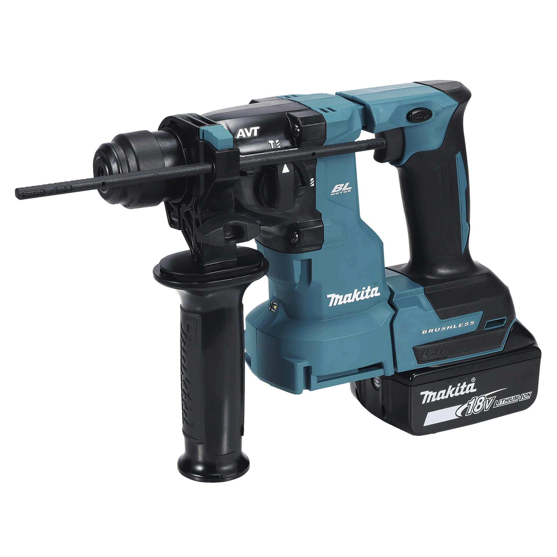 Akku-Bohrhammer für SDS-PLUS-Einsteckwerkzeuge mit bürstenlosem Motor. Mit XPT Staub- und Spritzwasserschutz. Der Handgriff ist vom Gehäuse entkoppelt für einer geringe Vibrationen beim Hammerbohren. Die Einzelschlagstärke erreicht bis zu 1,7 Joule, in Beton beträgt die Bohrleistung bis zu 18 mm. Mit Anschlussmöglichkeit für die Staubabsaugung DX16.