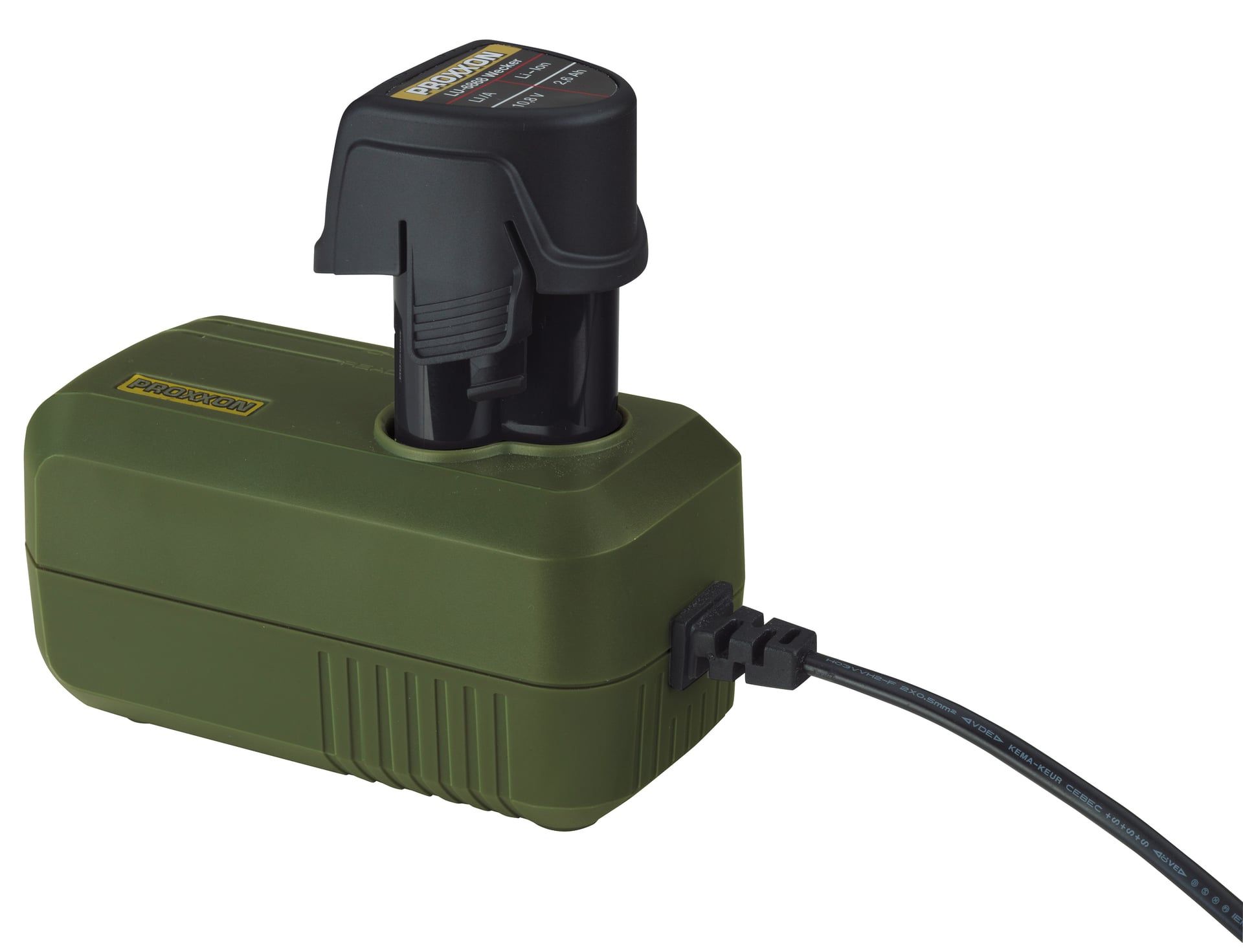 Das PROXXON Akku-Schnellladegerät LG/A2 lädt die PROXXON Li-Ionen Akkus in etwa einer Stunde. Mit integrierter Temperaturüberwachung. LED-Anzeige: Gelb = lädt, Grün = fertig.