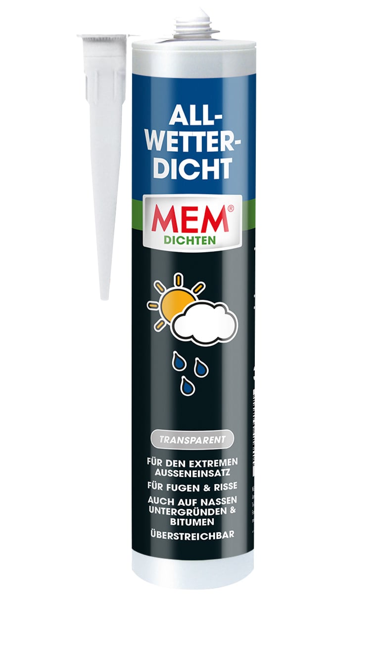 MEM Allwetter-Dicht ist ein lösemittelhaltiger Spezialdichtstoff für den extremen Außeneinsatz. Zur Reparatur von kleinen Fugen und Rissen zwischen Stein, Beton und Metall, zum Abdichten von Lecks in Dachrinnen und Fallrohren. Außerdem als Dachdichtungsmittel zum Kleben und Abdichten als Notreparatur. MEM Allwetter-Dicht hat eine gute Haftung auf den meisten am Bau üblichen Materialien, sogar auf nassen Untergründen und Bitumen, ist UV-beständig und überstreichbar.