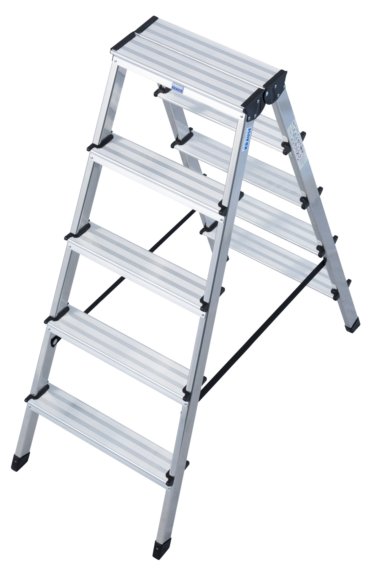 Leichte beidseitig begehbare Aluminium Stehleiter mit rutschsicheren, profilierten und bodenschonenden Fußkappen.Die Metall-Gelekverbindungen sind extra robust und schlagfest. Reißfeste Gurtbänder.