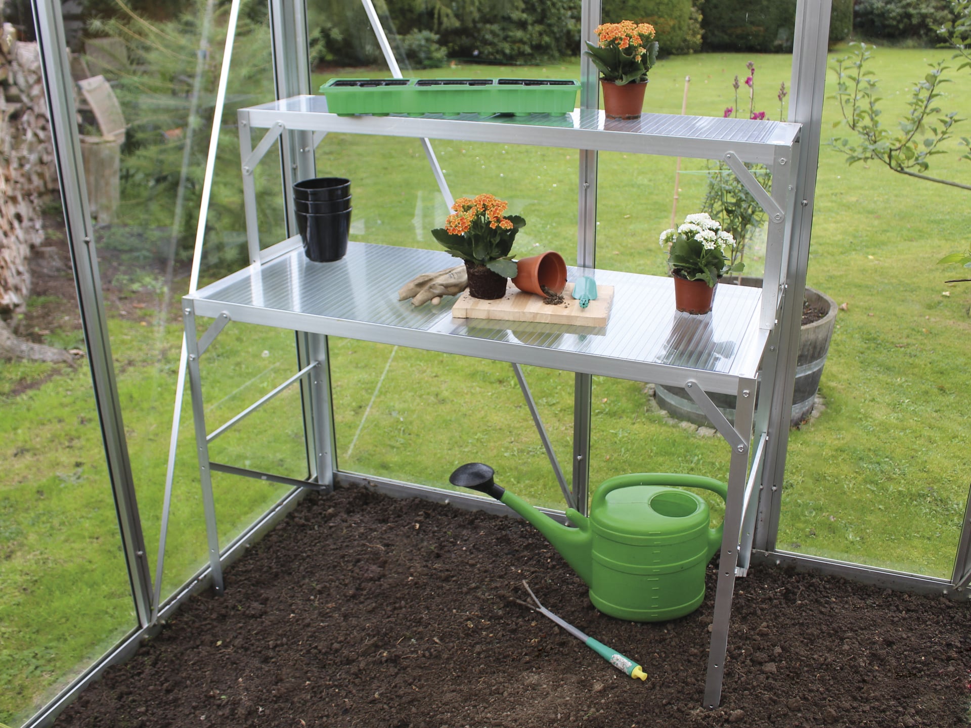 Der Tischaufsatz von Vitavia besteht aus eloxiertem oder auch bei den farbigen Varianten aus pulverbeschichtetem Aluminium. Er eignet sich für die Aluminium-Tische mit 1 und 2 Ebenen. Je nach Wahl erfolgt die Lieferung mit oder ohne die 16 mm starke Hohlkammerplatte als Ablagefläche.