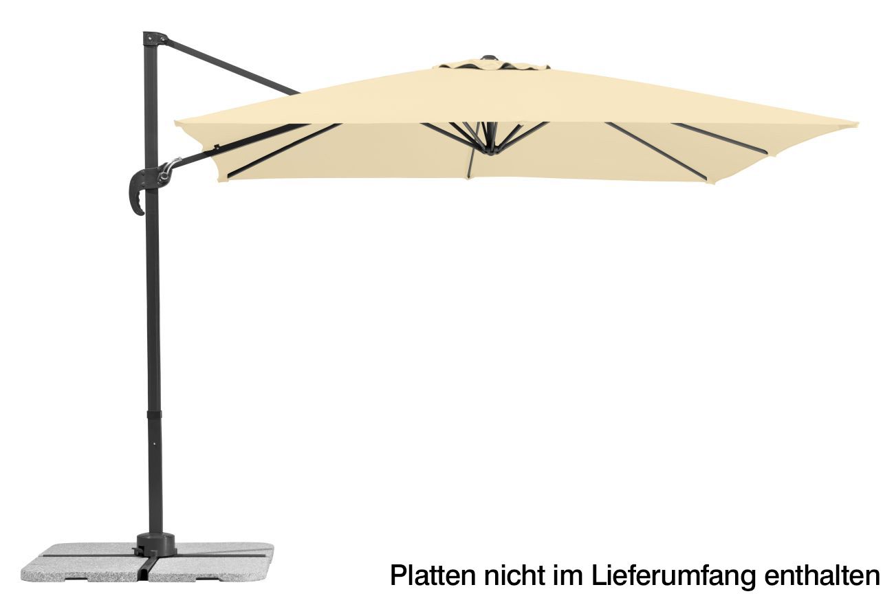 Dieser Sonnenschirm ist ein quadratischer Ampelschirm in der Größe 270 x 270 cm.