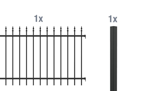 1 Zaunfeld Chaussee, Aluminium, matt schwarz, 2000×1000, 1 Zaunpfosten Chaussee, Circle, Aluminium, schwarz, zum Einbetonieren51x51/1500