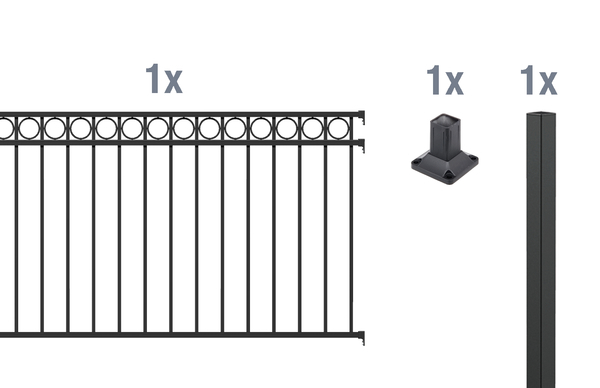 1 Zaunpfosten Chaussee, Circle, Aluminium, schwarz, zum Einbetonieren51x51/1500, 1 Pfostenträger Chaussee, Circle, Aluminium, schwarz, zum Aufschrauben,, 1 Zaunfeld Circle, Aluminium, matt schwarz, 2000×1000