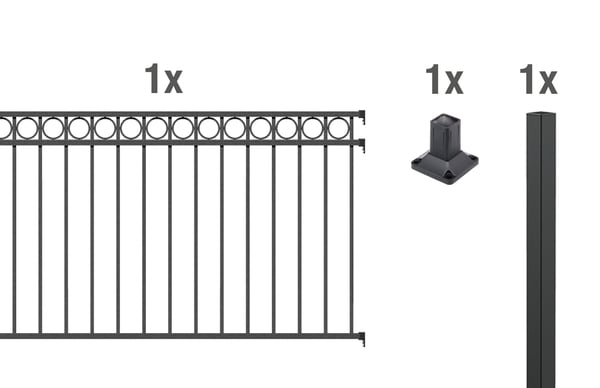 1 Zaunpfosten Chaussee, Circle, Aluminium, anthrazit, zum Einbetonieren51x51/1700, 1 Pfostenträger Chaussee, Circle, Aluminium, anthrazit, zum Aufschrauben,, 1 Zaunfeld Circle, Aluminium, anthrazit, 2000×1200