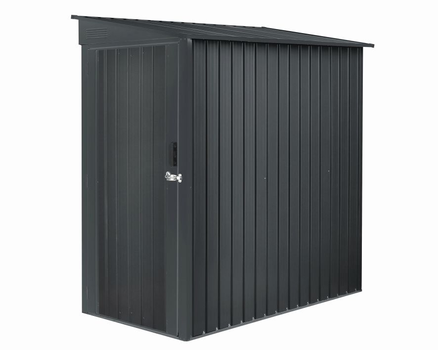 Das schmale Anlehn-Gerätehaus mit Schrägdach ist der ideale Problemlöser, wenn im eigenen Garten oder auf der Terrasse wenig Platz zur Verfu?gung steht. Das platzsparende Gerätehaus besteht aus einem verzinkten Bodenrahmen und profilierten Stahlblech-Seitenwänden. Im Giebel der Vorder- und Ru?ckseite befindet sich ein Belu?ftungsgitter. Die Flu?geltu?r ist sowohl mit einem Kunststoff-Griff wie auch einem Tu?r-Riegel ausgestattet und lässt sich bei Bedarf abschließen (ein Vorhängeschloss ist im Lieferumfang nicht enthalten). Das Anlehn-Gerätehaus kann auch freistehend verwendet werden.