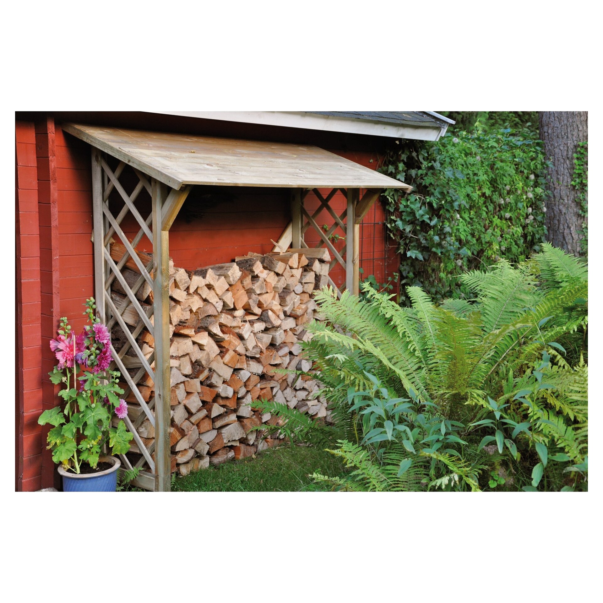 Das druckimprägnierte Kaminholzregal ANNE besteht aus den hochwertigen Hölzern Kiefer und Fichte. Damit Sie Ihr Regal auch sofort zum Einsatz bringen können, liegt das Montagematerial gleich bei. Dank des attraktiven Designs erfreut das Feuerholzregal das Auge. Die Seitenwände in durchbrochener Optik präsentieren sich als reizvolles Highlight und dienen zugleich einer guten Durchlüftung, um Ihr abgelagertes Holz gegebenenfalls optimal trocknen zu lassen. Mit seinem naturnahen Look fügt sich das Regal schön in beinahe jedes Ambiente ein und sorgt für elegante Akzente. Wenn Sie dann noch bepflanzte Blumentöpfe oder dekorative Garten-Objekte neben Ihren Brennholzunterstand stellen, ergibt sich ein besonders harmonisches Bild. Achtung: Biozidprodukte vorsichtig verwenden. Vor Gebrauch stets Etikett und Produktinformationen lesen.