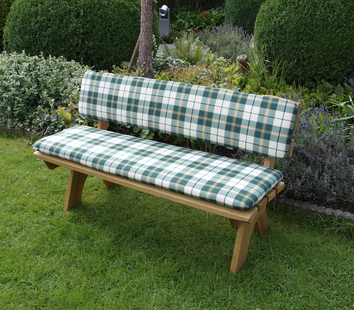 Mit dem grün-beige karierten Bankauflagen-Set Boston bringen Sie frische Farbe in Ihren Garten und erhöhen gleichzeitig den Sitzkomfort Ihrer Gartenbänke. Die Füllung der Sitzauflagen ist FCKW-frei und kann mittels Reissverschluss aus dem Bezug genommen werden. Die Auflage besteht aus einem Sitz- und einem Rückenpolster. Das Rückenpolster wird mit Klettbändern am Rückenteil der Bank befestigt.