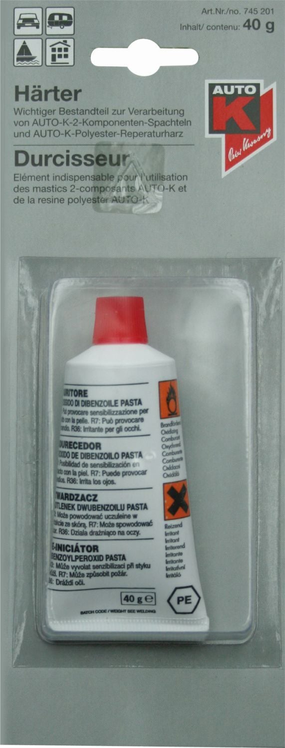 Auto-K Härter ist wichtig beim Einsatz von Polyester-Reparaturharz und 2K Spachtel, bitte im angegebenen Verhältnis mischen. Nur so wird das notwendige Aushärten von Polyester-Reparaturharz und Spachtel möglich.
