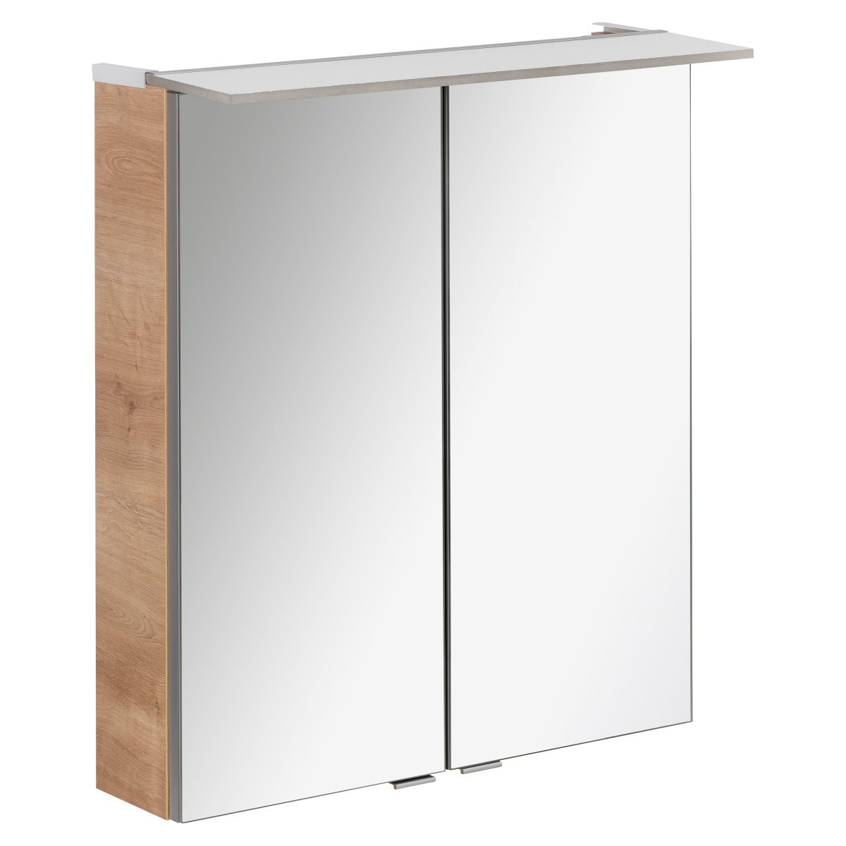 Der Fackelmann Spiegelschrank mit einer Breite von 600mm, hat einen Korpus in Ast Eiche Holzoptik. Die zwei Spiegeltüren sind mit einem Soft-Close-System ausgestattet, die ein leises und sanftes Schließen ermöglichen. Er bietet eine neutralweise LED-Beleuchtung und zwei Innenspiegel für das perfekte Styling. Dieser Schrank ist Teil der Serie B.perfekt und Made in Germany.