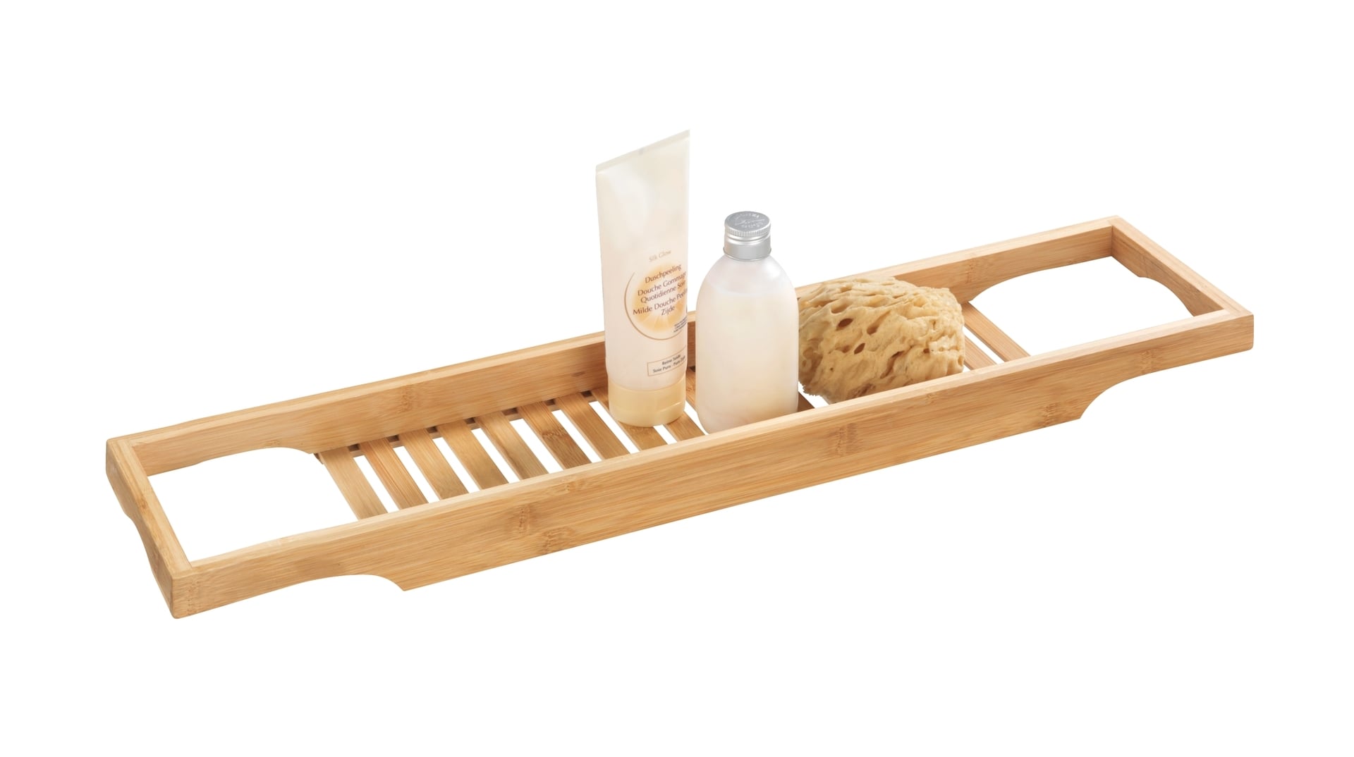 Vielseitiges Bad-Accessoire: Das Badewannentablett aus Bambus lässt sich quer über der Badewanne flexibel platzieren. Ob näher dran oder weiter weg – der Badewannenbutler hält Buch und Glas stets sicher und griffbereit.