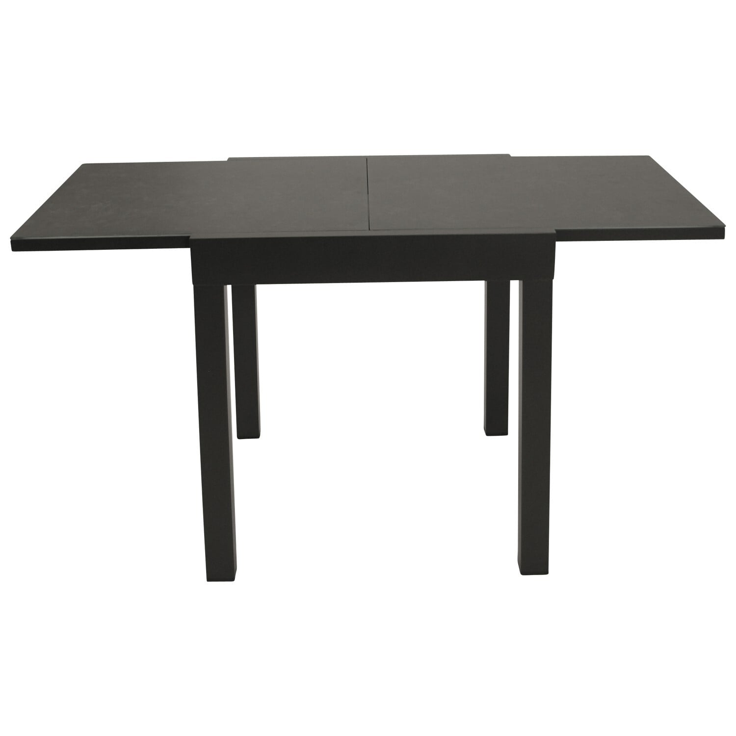 Balkon-Ausziehtisch 70/140cm mit Gestell aus Aluminium anthrazit, Keramikoptik dunkelgrau. Tischplatte aus Glas.