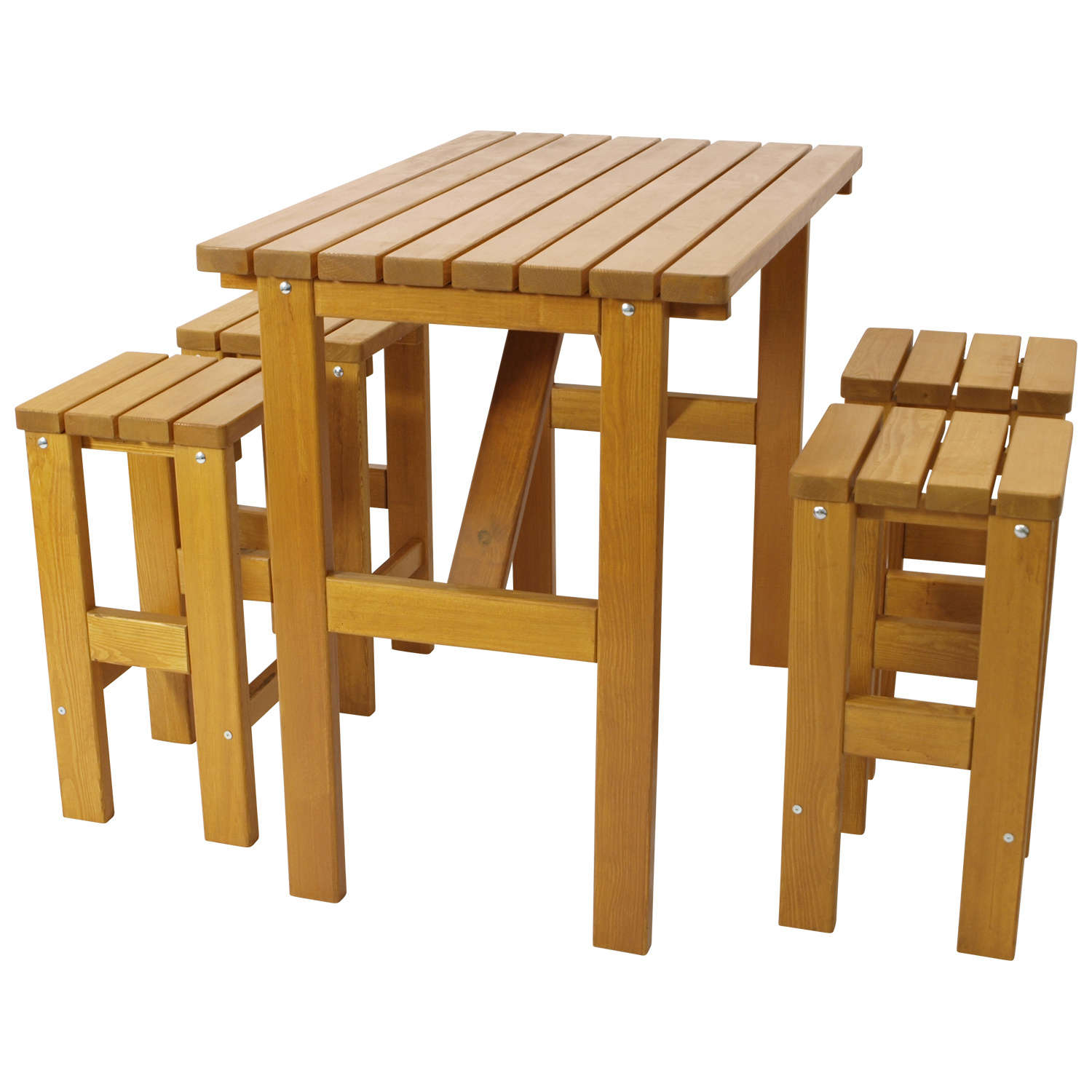 Stabiles Barset aus massivem Kiefernholz 40mm stark, hell grundiert und lackiert, bestehend aus 4x Barhocker und 1x Bartisch 125x80cm.