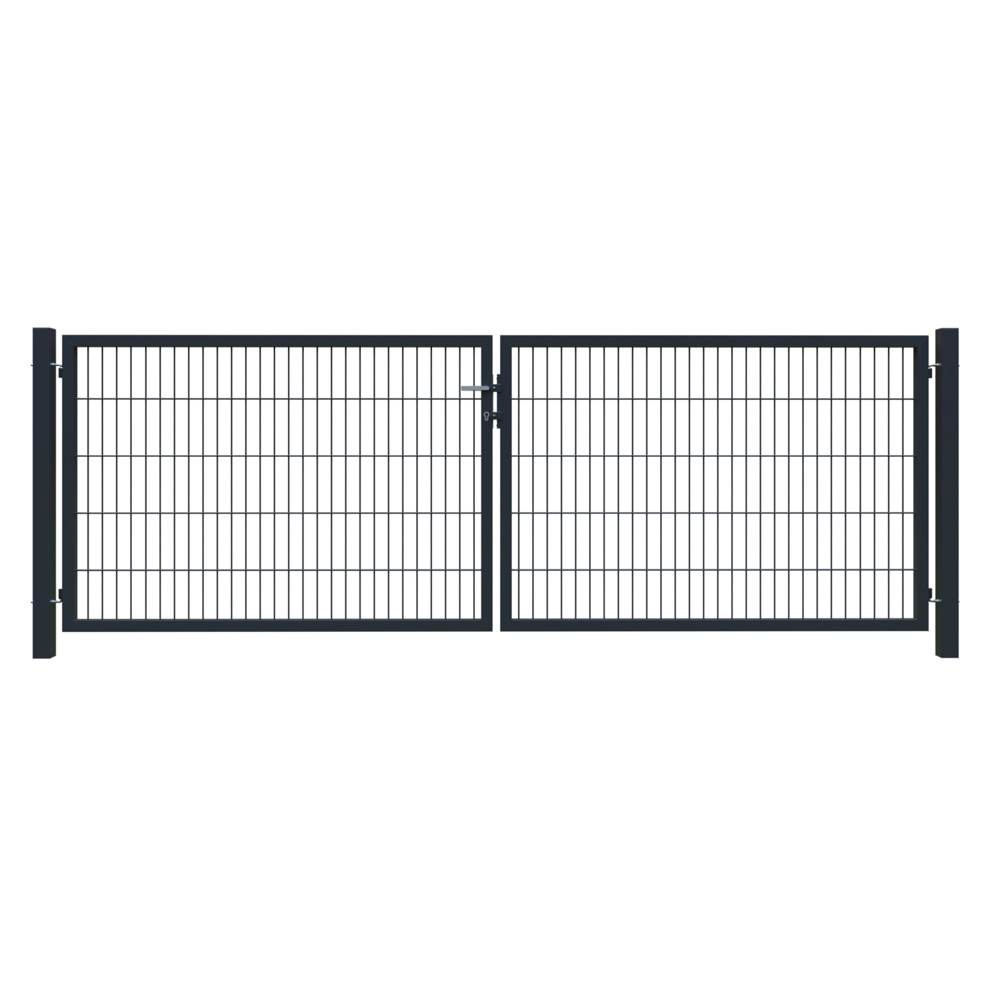 BASIC-Doppeltor, inkl. Pfosten (60 x 60 mm ohne Zaunanschlüsse), Torbeschlag, Drückergarnitur, PZ-Schloss vorgerichtet, verzinkt und pulverbeschichtet grün (RAL 6005) oder anthrazit (RAL 7016), DIN rechts/links verwendbar, verstellbare Scharniere, Maschenweite 50 x 200 mm, Drahtstärke 6/5/6 mm, Torbreite 300 cm (lichtes Maß), Öffnungswinkel 180 °.