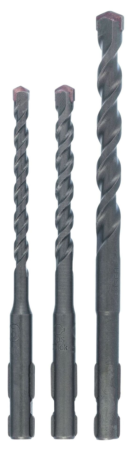Betonbohrer-Set SDS quick, 3-teilig. Inhalt: 3 SDS quick-Betonbohrer mit Durchmesser: 5 / 6 / 8 mm, Länge: 100 / 100 / 120 mm. Die hammerfesten Hochleistungsbohrer. Betonbohrer mit SDS quick-Schaft. Betonbohrer zum einfachen und schnellen Dübelsetzen. SDS quick: Schaftsystem für Uneo/Uneo Maxx sowie für alle hundelsüblichen Dreibackenbohrfutter. Mit SDS quick-Schaft für maximale Drehmomentübertragung. Geeignet für harten Beton, Naturstein, Kunststein und Mauerwerk. Optimale Drehmomentübertragung: Die innovative SDS quick-Flügelkonstruktion bietet eine optimale Kraftübertragung ohne Reibungsverluste. Hohe Kompatibilität: Bohrer mit SDS quick-Schaft können auch in herkömmlichen Bohrfuttern verwendet werden. Hohe Lebensdauer: Sicherer Halt im Bohrfutter verhindert ein Durchrutschen. Dadurch ergibt sich eine wesentlich geringere Abnutzung des Geräts. Mit hammerfester Hartmetallspitze für hohe Bohrleistung und lange Lebensdauer.