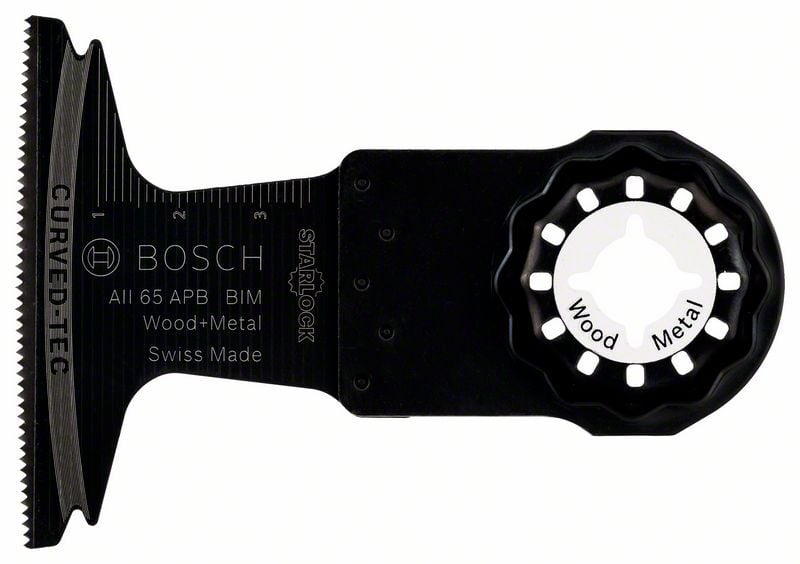 Starlock BIM Tauchsägeblatt AII 65 APB Holz und Metal. Eintauchtiefe: 40 mm, Breite: 65 mm. Werkstoff: BIM. Schneiden von Holz mit Nägeln. Türstock am Boden ablängen (Weichholz, Hartholz, furnierte Platten, kunststoffbelegte Platten). Tauchschnitte in beschichtete Platten (z. B. Aussparungen für ein Tablar).