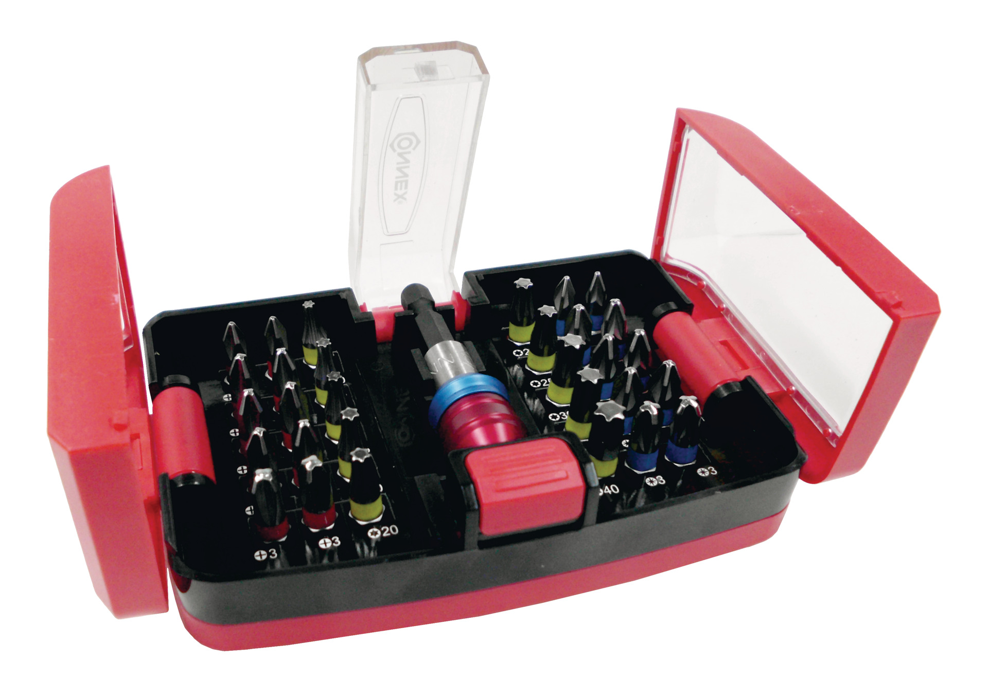 Bits aus Silizium-Molybdän-Stahl (S2) in Profiqualität, 1/4” Antrieb, patentierter Bithalter mit starkem Magnet und Schnellwechselfutter, Farbleitsystem für einfache Bitauswahl, automatische Öffnung durch Knopfdruck