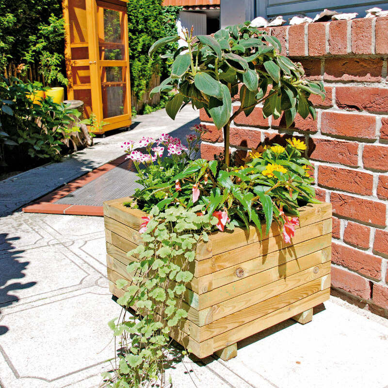 Natürliches Design mit stabiler Konstruktion Der MAX Blumenkübel ist die perfekte Kombination aus natürlicher Optik und robuster Verarbeitung. Gefertigt aus druckimprägniertem Kiefer- und Fichtenholz bietet er Langlebigkeit, Witterungsbeständigkeit und ein klassisches Erscheinungsbild im natürlichen Holz-Look. Mit seiner quadratischen Form und den kompakten Maßen von 50 × 50 × 38 cm eignet sich der Pflanzkübel ideal für Blumen, Kräuter, kleine Sträucher oder dekorative Bepflanzungen im Außenbereich. Witterungsbeständig und langlebig Durch die grüne Kesseldruckimprägnierung ist das Holz optimal gegen Feuchtigkeit, Pilzbefall und Witterungseinflüsse geschützt. Die stabile Bauweise mit 45 × 45 mm starken Kanthölzern sorgt für Formstabilität und eine lange Lebensdauer – auch bei dauerhafter Nutzung im Freien. Damit ist der MAX Blumenkübel eine pflegeleichte und nachhaltige Lösung für Gärten, Terrassen und Balkone. Praktischer Folieneinsatz inklusive Im Lieferumfang ist ein passgenauer Folieneinsatz enthalten, der das Holz zusätzlich vor Feuchtigkeit schützt und die Bepflanzung erleichtert. Dadurch kann der Kübel sofort bepflanzt werden, ohne dass zusätzliche Vorbereitungen erforderlich sind. Der Einsatz verlängert die Haltbarkeit des Holzes und verhindert das Durchsickern von Wasser und Erde. Vielseitige Einsatzmöglichkeiten Ob als dekorativer Pflanzkübel auf der Terrasse, als Kräuterbeet auf dem Balkon oder als stilvolles Gestaltungselement im Garten – der MAX Blumenkübel passt sich jedem Ambiente harmonisch an. Durch seine natürliche Holzoptik fügt er sich ideal in grüne Umgebungen ein und unterstreicht das Gesamtbild einer liebevoll gestalteten Außenanlage. Technische Daten Material: Kiefer/Fichte Maße (B × T × H): 50 × 50 × 38 cm Form: quadratisch Kanthölzer: 45 × 45 mm Oberfläche: druckimprägniert grün Inklusive passgenauem Folieneinsatz Fazit Mit dem MAX Blumenkübel entscheidest du dich für ein hochwertiges, witterungsbeständiges und optisch ansprechendes Pflanzgefäß aus Naturholz. Er überzeugt durch Stabilität, Funktionalität und Nachhaltigkeit – ideal für stilvolle Gartenprojekte und individuelle Bepflanzungen.