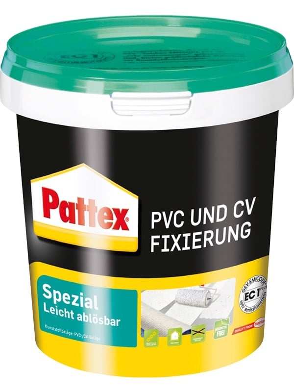 Mit dem Pattex Fußbodenkleber PVC & CV Fixierung Spezial können vollflächige Befestigungen von CV und PVC Bodenbelag mit und ohne Vliesrücken im Wohnbereich erzielt werden. Der Kleber ist wasserfest, frost- und temperaturbeständig (bis +50 °C nach Aushärtung) und überzeugt mit hoher Anfangs- und Endklebkraft – belastbar schon nach 24 Stunden. Auch für Fußbodenheizung ist der Klebstoff ideal geeignet und kann dank seiner langen offenen Zeit von 60 Minuten einfach korrigiert und wieder abgelöst werden. Der Pattex Bodenkleber ist lösemittelfrei, geruchs- und emissionsarm (EC-1-geprüfte Rezeptur) und für eine leichte Verarbeitung sofort gebrauchsfertig.