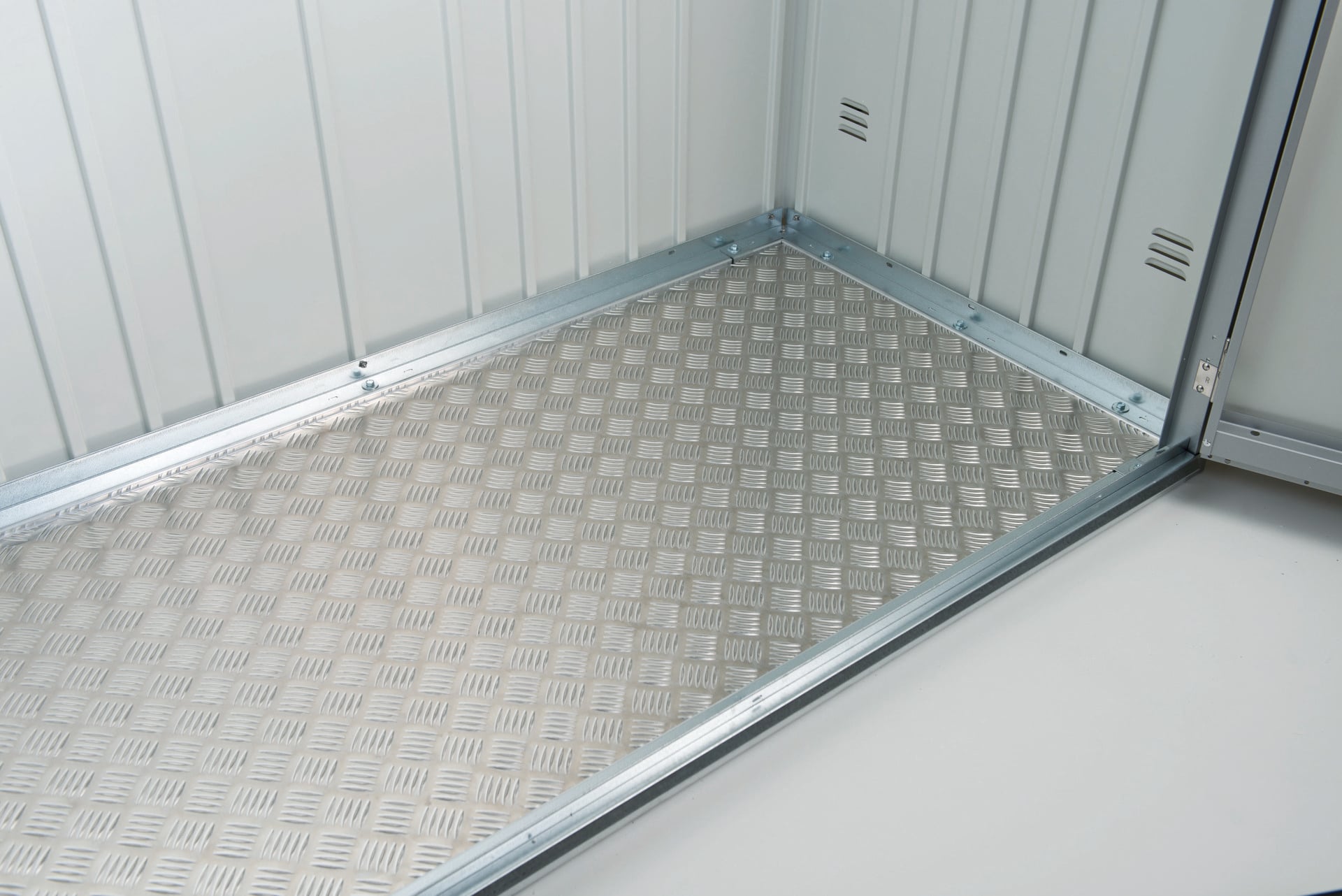 Hochwertiger Alu-Riffelblechboden, elegant und funktionell. Der Boden besteht je nach Hausgröße aus 1 bis 5 Segmenten inklusive Verbindungsschienen. Zur optimalen Verlegung der Alu-Bodenplatten ist der Alu-Bodenrahmen erforderlich. Beachten Sie bitte, dass die ALU-Bodenplatte mit einer Schüttung oder XPS-Hartschaumplatten in einer Stärke von ca. 2-3 cm zu unterfüttern ist (nicht im Lieferumfang enthalten).
