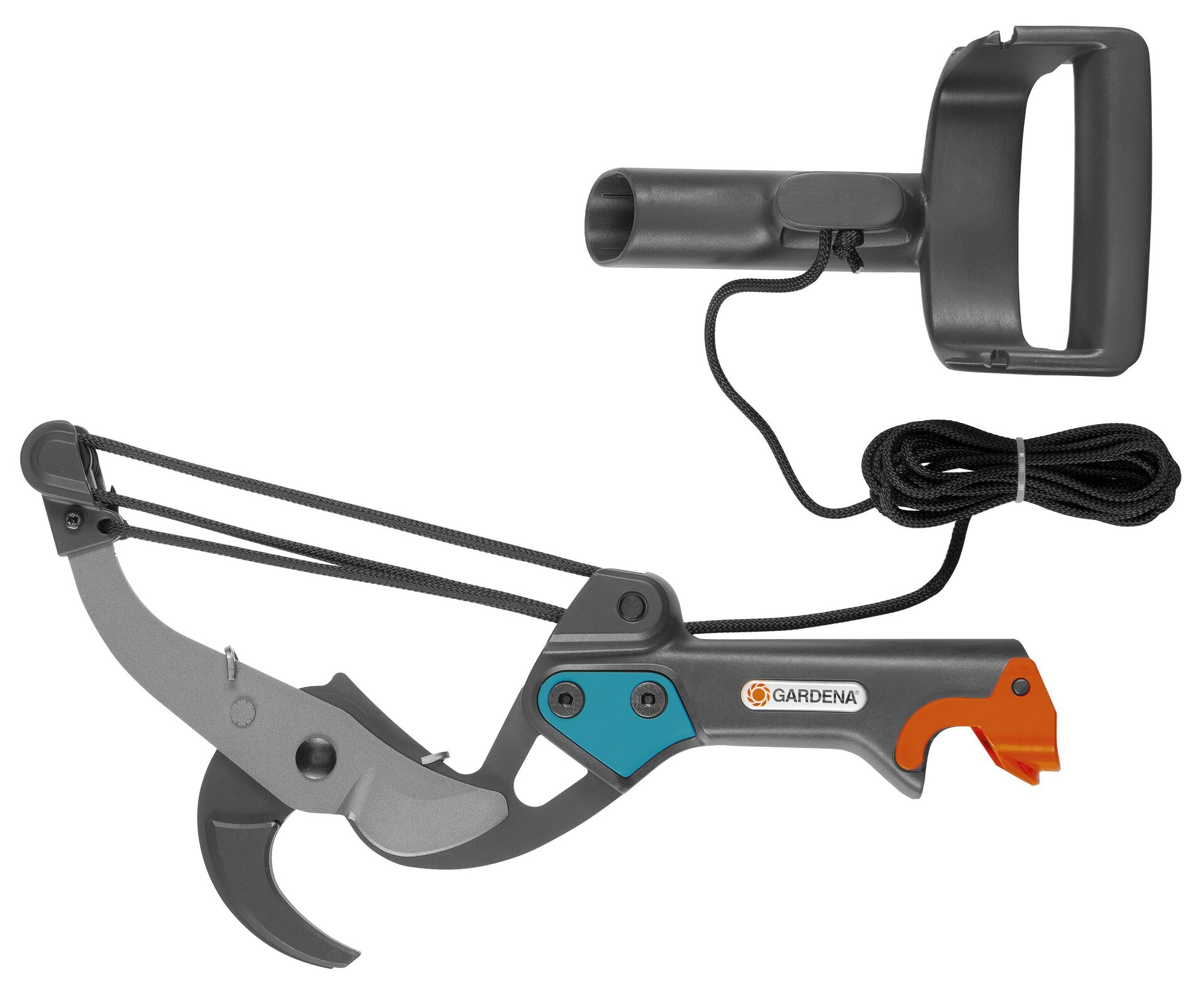 Die GARDENA combisystem Amboss-Baumschere ist optimal für das Schneiden von Ästen in großen Höhen geeignet. Mit einem GARDENA combisystem Teleskopstiel schneiden Sie die Äste sicher vom Boden aus ohne Leiter. Dank der integrierten doppelten Hebelübersetzung und der 5-fachen Rollenübersetzung ist die Bedienung enorm kraftsparend und gewährleistet damit ein müheloses Schneiden von Ästen mit einem Durchmesser bis zu 35 mm. Die Antihaftbeschichtung der Messer und ihre spezielle Geometrie fixieren den Ast beim Schneiden, sorgen für einen exakten und sauberen Schnitt und lassen sich anschließend einfach reinigen. Die integrierte Asteinhängung erleichtert Ihnen die Arbeit zusätzlich. Der einstellbare D-Griff macht die Bedienung der Baumschere besonders komfortabel. Zusätzlich verfügt der Griff über eine Seilaufwicklung inklusive Fixierung, damit sich das Seil bei der Bedienung und Lagerung der Schere nicht verknotet. Das Zugseil ist 4,7 m lang und reißfest.