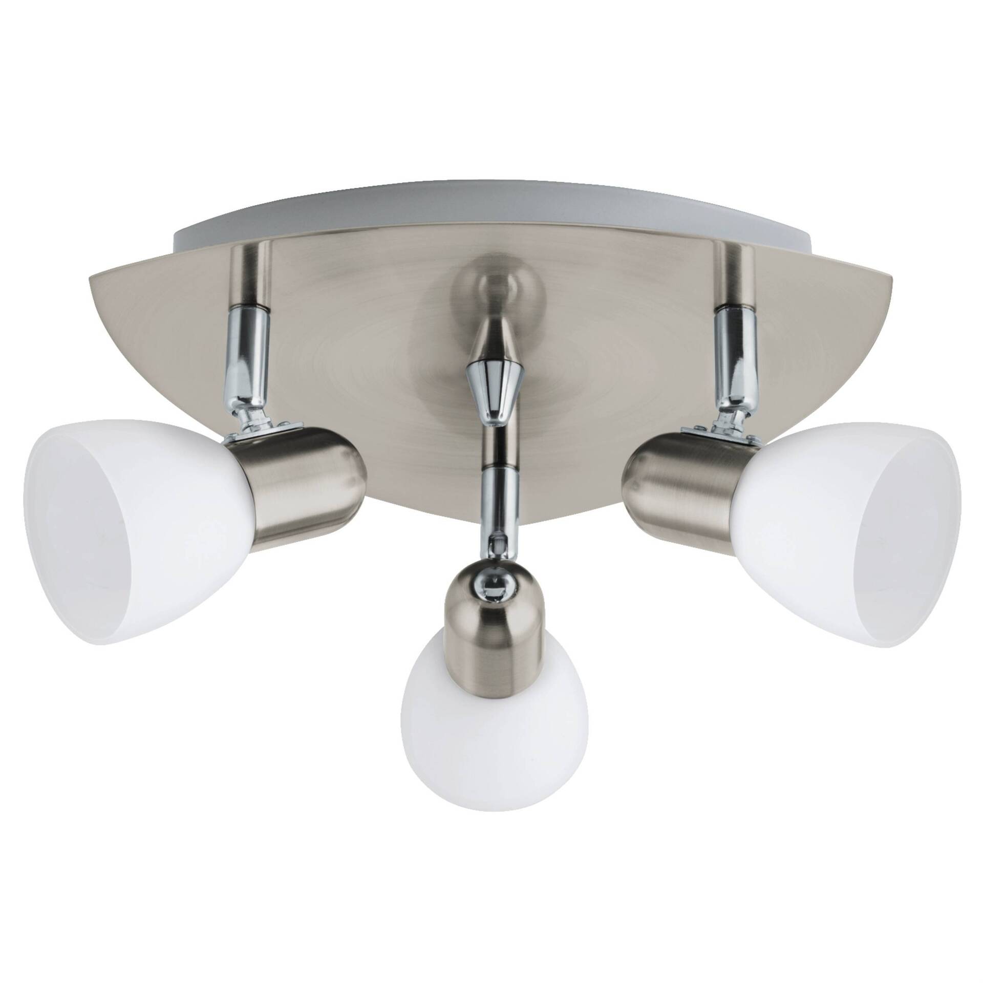 Die Deckenleuchte ENEA ist aus einem dreieckigen Metall-Körper in Nickel-Matt mit drei beweglichen Spots gefertigt. Die Spots wurden mit weiß-satinierten Glas-Schirmen kombiniert, die das zeitlose Design der Deckenlampe abrunden. Der Deckenspot bietet Ihnen die Möglichkeit einzelne Lichtakzente im Raum zu setzen – egal ob in der Küche, im Wohnzimmer, Schlafzimmer oder Flur. Die Leuchtmittel sind nicht im Lieferumfang enthalten. Geeignet ist die Leuchte für jedes Leuchtmittel mit E14-Sockel.