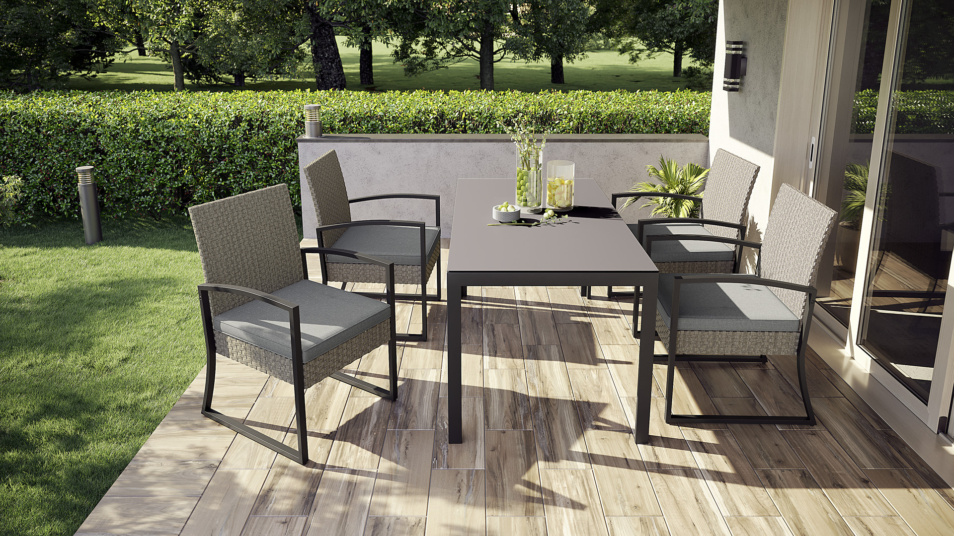 Moderner Dinning-Sessel aus stabilem Aluminiumgestell und Kunststoffgeflecht.