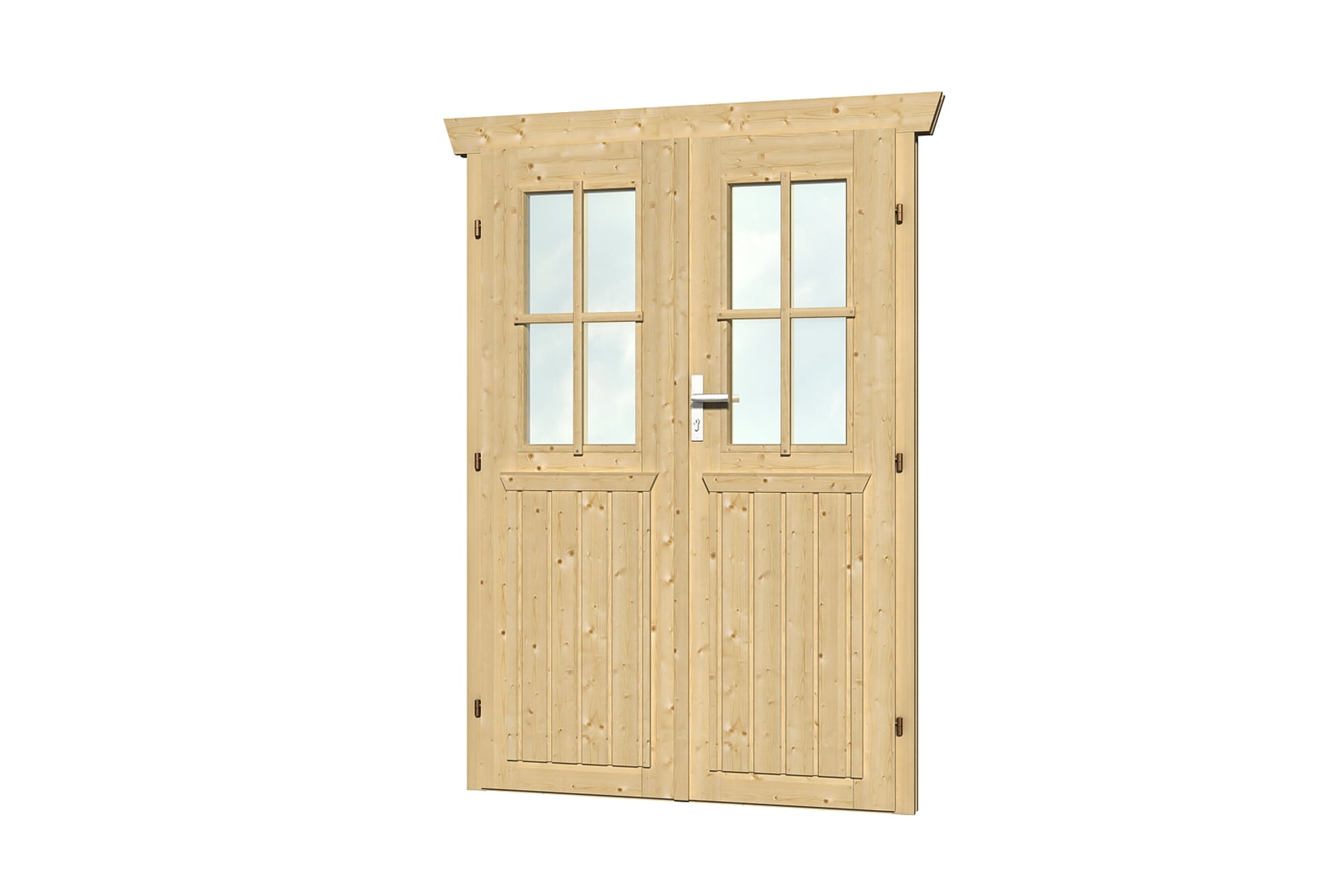 Die halbverglaste SKAN HOLZ Doppeltür verfügt über Echtglas-Scheiben sowie aufgesetzte Sprossen. Die Sprossen können wahlweise montiert oder weggelassen werden. Die Zargenkonstruktion ist zum Einbau in eine 28 mm starke Blockbohlenwand vorgesehen. Lieferung erfolgt inklusive Beschlägen und Zylinderschloß mit 3 Schlüsseln.