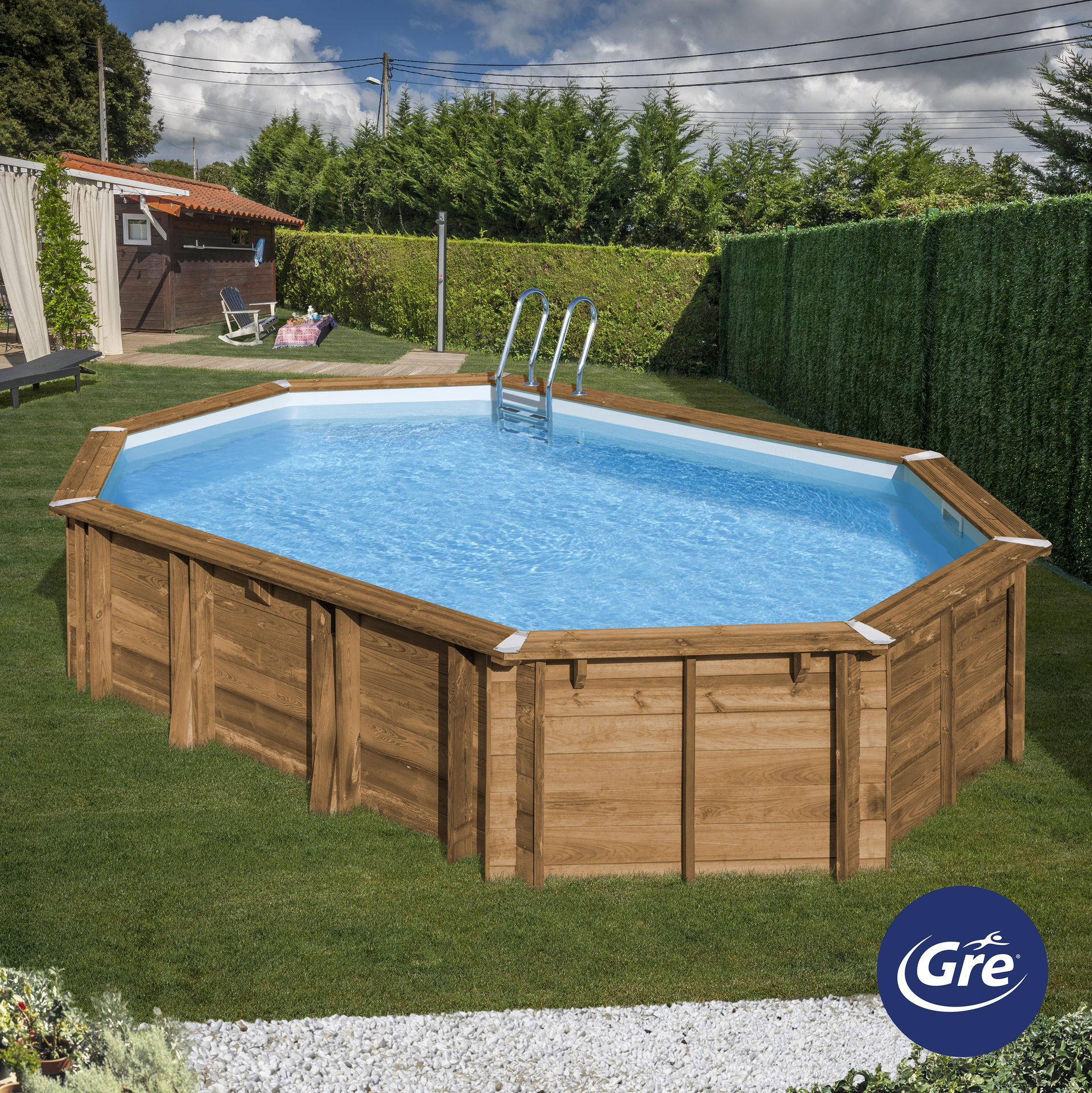 AVOCADO – Ovaler Echtholzpool 656 x 456 x 131 cm (Außenmaß) – vol: 24,7m3 – 75/100 Poolfolie – 8m3/h Sandfilter – Edelstahlleiter – Boden und Wandschutzvlies