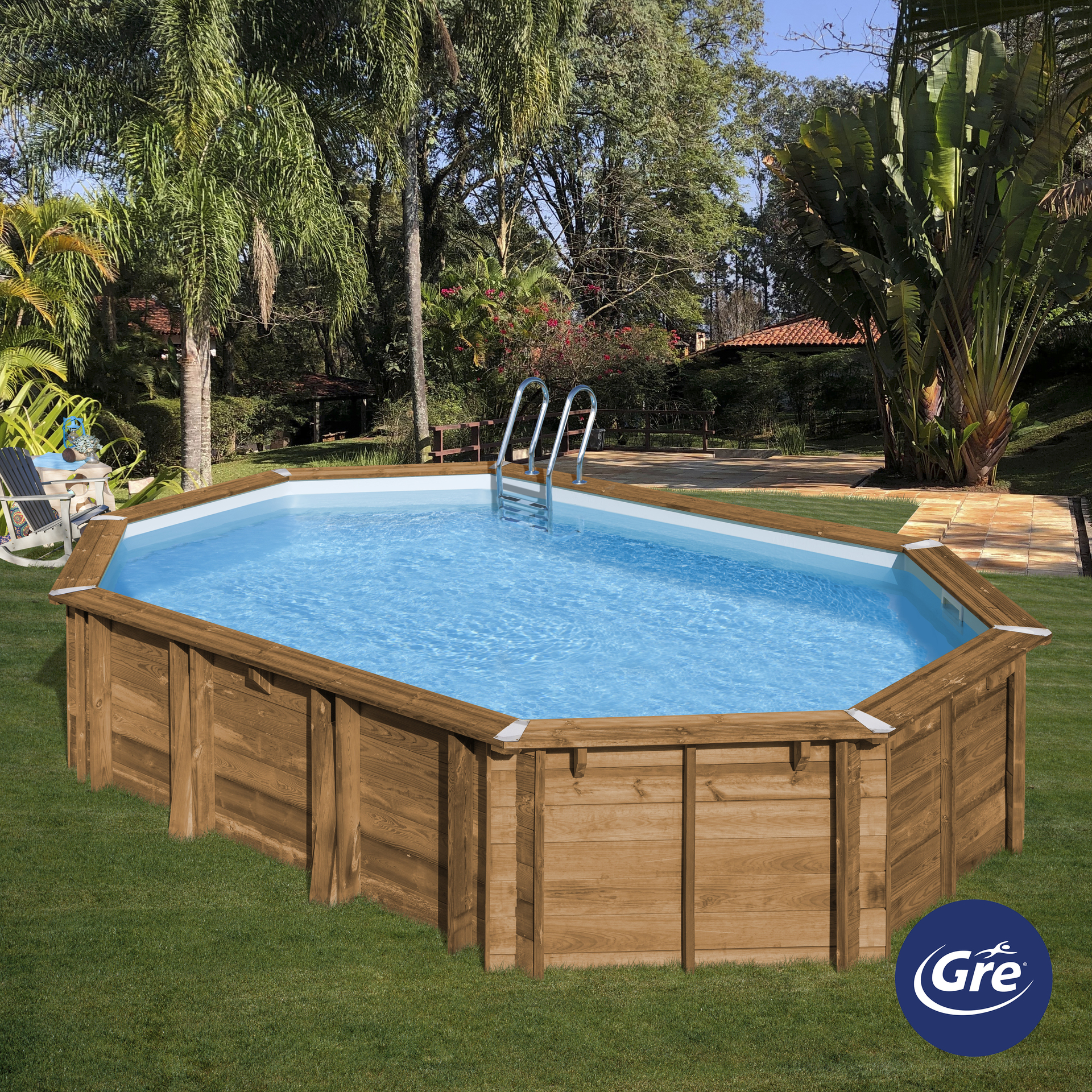 SAFRAN 2 – Ovaler Echtholzpool 620 x 395 x 136 cm (Außenmaß) – vol: 22m3 – 75/100 Poolfolie – 8m3/h Sandfilter – Edelstahlleiter – Boden und Wandschutzvlies