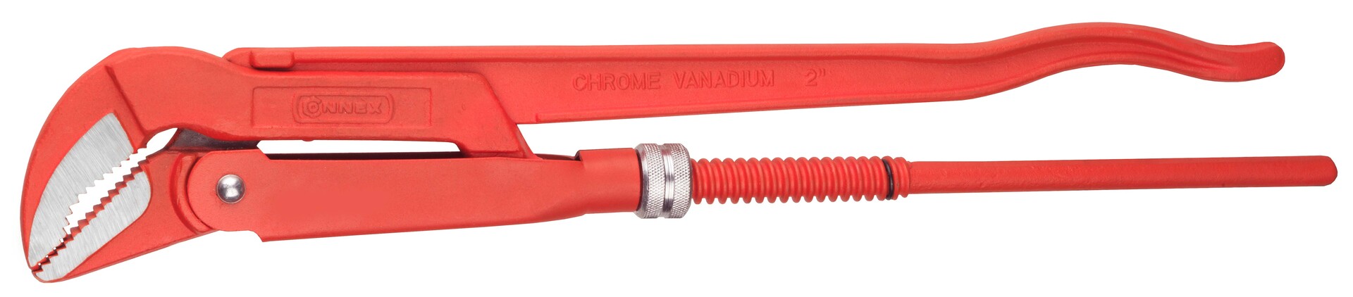 Die Eckrohrzange von CONNEX ist aus Chrom-Vanadium-Stahl geschmiedet und vergütet. Das Zangenmaul ist um 45° abgewinkelt. Die Zähne sind induktiv gehärtet.