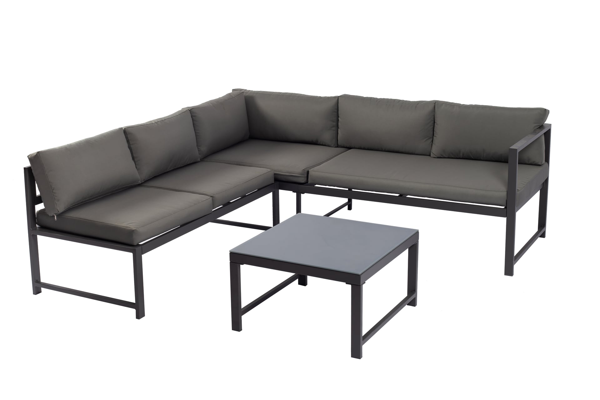 Loungeset mit Ecksofa und Loungetisch, Aluminium grau, Tisch mit Glasplatte grau. Mit Polstern grau, Bezüge 100% Polyester. Ein Sofa mit Liegefunktion.