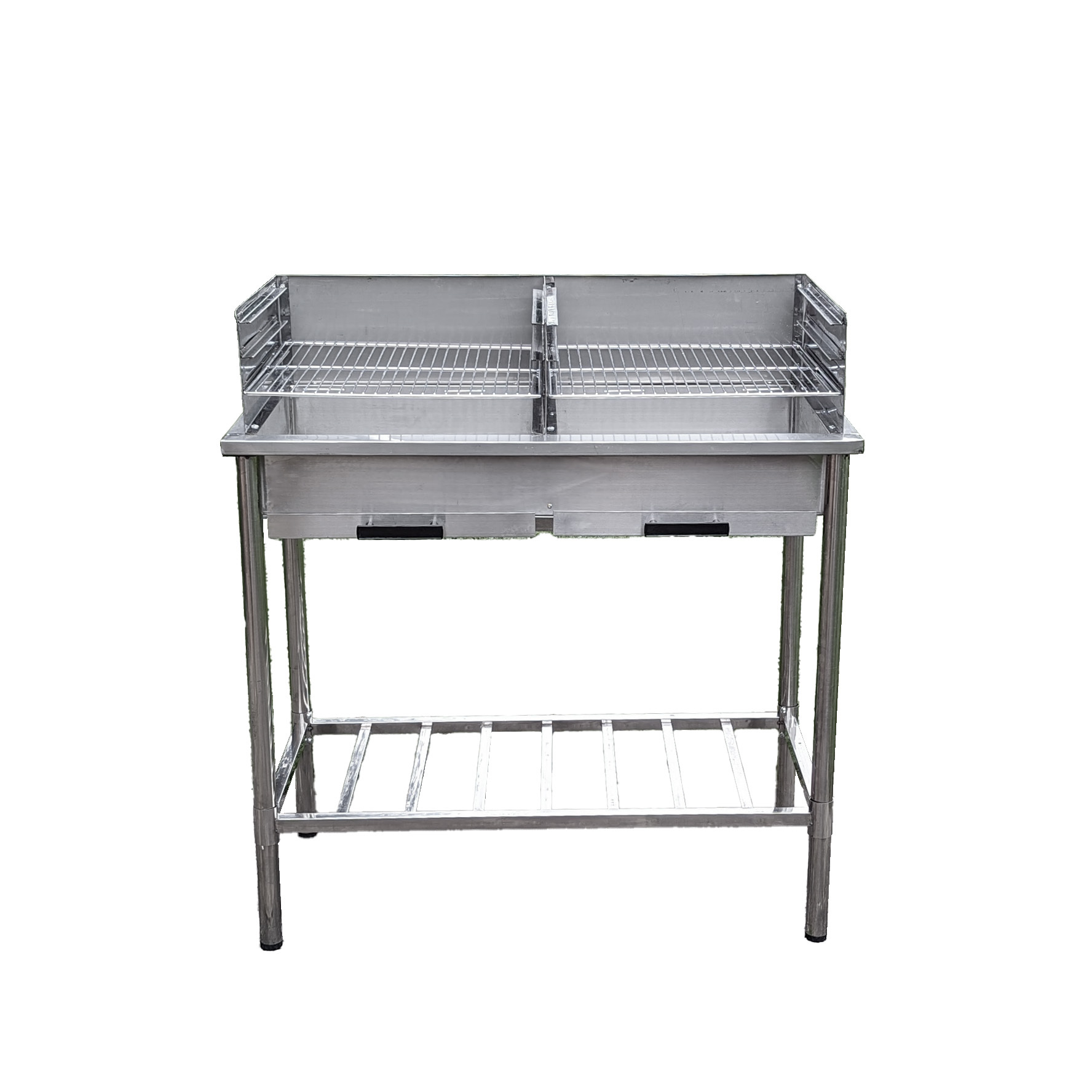 Die ideale Ergänzung unseres Modulsystems “Country-Life” – Der große Edelstahl-Grilltisch mit 2 höhenverstellbaren Grillflächen, 2 Ascheschubkästen und einem Ablageboden. Alle Beine sind einzeln höhenverstellbar.