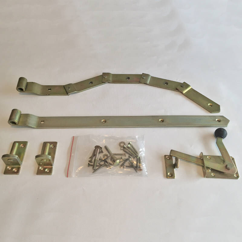Einzeltor Beschlag gebogen Der gebogene Einzeltor Beschlag ist aus verzinktem Metall gefertigt und passend für Einzeltore mit Bogen, wie beispielsweise der Serien BRUNO und HUGO. Der Beschlag besteht aus Torbändern und der Drückergarnitur. Die Bänderlänge beträgt 60 cm.