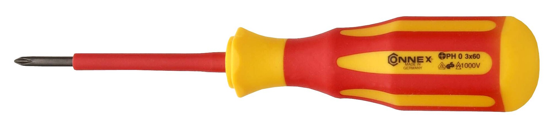 Der Elektriker-Kreuzschlitz-Schraubendreher von CONNEX für das Arbeiten an stromführenden Teilen. Zum Gebrauch bis AC 1000V und DC 1500V. Mit dem vollisolierten Griff und der isolierten Klinge wird höchste Sicherheit erreicht. Bestätigt wird dies durch die VDE/GS Prüfung. Geprüft und zertifiziert nach DIN EN 60900. Die ergonomische Griffform gewährleistet höchste Kraftübertragung und ein ermüdungsfreies Schrauben. Die Klingen bestehen aus hochlegiertem, zähem Chrom- Vanadium- Spezialstahl. Die brünierte Spitze sichert eine hohe Passgenauigkeit der Elektriker- Schlitz- Schraubendrehers. Made in Germany.