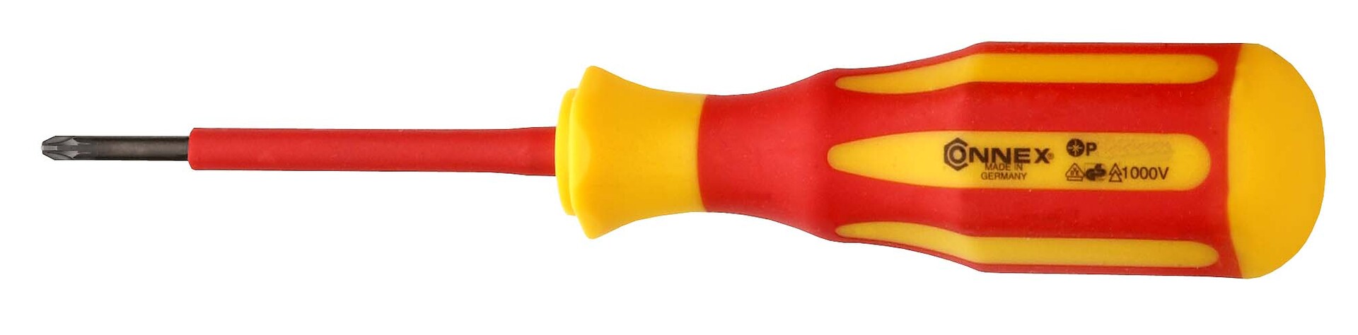 Der Elektriker-Pozidriv-Schraubendrehervon CONNEX ist für Arbeiten an stromführenden Teilen. Zum Gebrauch bis AC 1000V und DC 1500V. Mit dem vollisolierten Griff und der isolierten Klinge wird höchste Sicherheit erreicht. Bestätigt wird dies durch die VDE/GS Prüfung. Geprüft und zertifiziert nach DIN EN 60900. Die ergonomische Griffform gewährleistet höchste Kraftübertragung und ein ermüdungsfreies Schrauben. Die Klingen bestehen aus hochlegiertem, zähem Chrom- Vanadium- Spezialstahl. Die brünierte Spitze sichert eine hohe Passgenauigkeit der Elektriker- Schlitz- Schraubendrehers. Made in Germany.