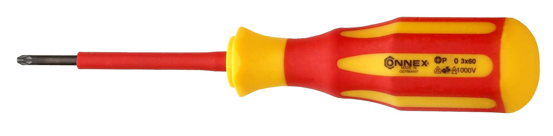 Der Elektriker-Pozidriv-Schraubendrehervon CONNEX ist für Arbeiten an stromführenden Teilen. Zum Gebrauch bis AC 1000V und DC 1500V. Mit dem vollisolierten Griff und der isolierten Klinge wird höchste Sicherheit erreicht. Bestätigt wird dies durch die VDE/GS Prüfung. Geprüft und zertifiziert nach DIN EN 60900. Die ergonomische Griffform gewährleistet höchste Kraftübertragung und ein ermüdungsfreies Schrauben. Die Klingen bestehen aus hochlegiertem, zähem Chrom- Vanadium- Spezialstahl. Die brünierte Spitze sichert eine hohe Passgenauigkeit der Elektriker- Schlitz- Schraubendrehers. Made in Germany.