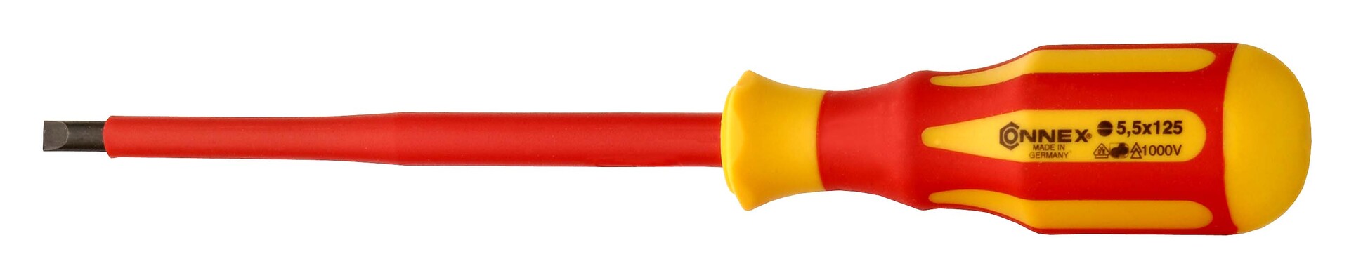 Elektriker-Schlitz-Schraubendreher von CONNEX für Arbeiten an stromführenden Teilen. Zum Gebrauch bis AC 1000V und DC 1500V. Mit dem vollisolierten Griff und der isolierten Klinge wird höchste Sicherheit erreicht. Bestätigt wird dies durch die VDE/GS Prüfung. Geprüft und zertifiziert nach DIN EN 60900. Die ergonomische Griffform gewährleistet höchste Kraftübertragung und ein ermüdungsfreies Schrauben. Die Klingen bestehen aus hochlegiertem, zähem Chrom- Vanadium- Spezialstahl. Die brünierte Spitze sichert eine hohe Passgenauigkeit der Elektriker- Schlitz- Schraubendrehers. Made in Germany.