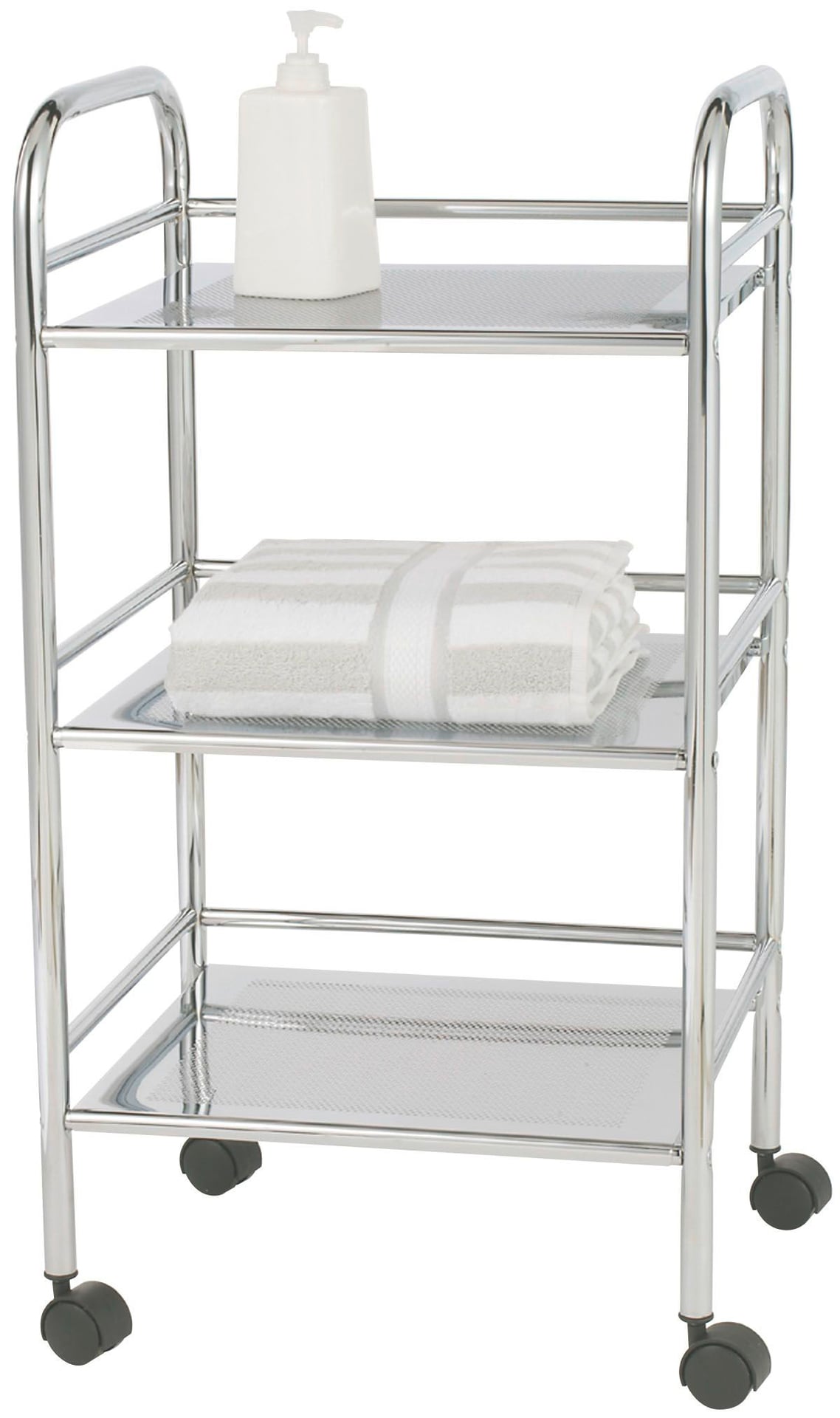 Mit drei Lochblech-Regalböden bietet er viel Platz und Stauraum sowie dekorative Stellmöglichkeiten für Haushalt- oder Bad-Accessoires. Durch seine vier Laufrollen ist er jederzeit einfach und flexibel neu positionierbar.